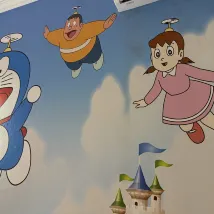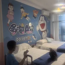 這是我住過性價比較低的酒店,2分的衞生是給床鋪的,2分的環境是給床頭漫畫貼的,3分的設施是給那大床及走廊的裝飾的。狹窄的房間,打開搖搖欲墜的門,床頭的多拉A夢孩子很喜歡。雜亂的電視線路,一個牀頭櫃替代簡單的電視櫃,特別是沒窗簾的衞生間,一面被紅磚補密實的窗户,都很拉跨,沒洗的漱口杯,坐便上的污漬都無一彰顯着:臟!