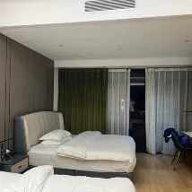 房間內設施很普通,價位偏高了些,前台穿着很隨意的便衣,沒有看到穿工作服。房間用手擦拭茶几、牀頭櫃,發現手上有灰塵,房間配備的毛巾浴巾是一次性的,使用沒什麼質感,輕飄飄不怎麼吸水,洗髮水沐浴露是非常大瓶的那種,給我的感覺不好,我沒有用,用自己帶的。拖鞋是非常薄的那種,穿的時候得彎腰用手把鞋背撐開才能穿進去。希望老闆不要衹顧着賺錢,價高還配備差。