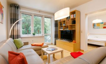 Apartment house, 4 storeys. In the resort 500 m from the centre of Zinnowitz, 300 m from the sea, 300 m from the beach. In the house: lift, storage room for bicycles, central heating system. Parking at the house. Supermarket 650 m, bakery, café 270 m, bus stop 180 m, railway station 1 km, sandy beach 300 m, thermal baths "Bernsteintherme" 240 m. Marina 2.6 km, golf course (18 hole) 25 km, surf school 240 m, tennis 750 m, minigolf. "Strandgut", 2-room apartment 63 m2 on 2nd floor. Beautiful furnishings: living/dining room with cable TV (flat screen), radio. 1 room with 1 double bed. Kitchenette (oven, dishwasher, 4 ceramic glass hob hotplates, toaster, kettle, microwave, electric coffee machine). Shower/WC. Parking (1 car) at the house. Please note: non-smokers only. Smoke alarm.