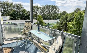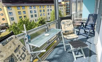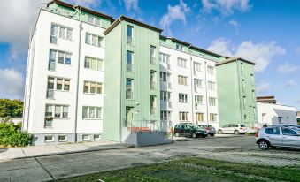 Apartment house, 4 storeys. In the resort 500 m from the centre of Zinnowitz, 100 m from the sea, from the beach. In the house: lift, storage room for bicycles, central heating system. Parking at the house. Supermarket 650 m, bakery 270 m, café 270 m, bus stop 110 m, railway station 1 km, sandy beach 100 m, thermal baths "Bernsteintherme" 240 m. Marina 2.6 km, golf course (18 hole) 25 km, surf school 240 m, tennis 750 m, minigolf. Please note: lift to 3rd floor. "Karsten", 2-room apartment 50 m2 on 2nd floor. Living/dining room with cable TV (flat screen), radio. Exit to the balcony. 1 room with 1 double bed. Small kitchen (oven, 4 ceramic glass hob hotplates, microwave). Shower/WC. Balcony. Balcony furniture. Parking (1 car) at the house. Please note: non-smokers only. Smoke alarm.