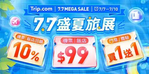【2025年7月7日,台北訊】-暑假旅遊狂潮來襲,全球領先的線上旅遊平台 Trip.com 推出快閃4天「盛夏旅展」, 7 月 7 日起至7月10日於指定活動頁購買機票、住宿,最低享 99 元起銅板價,台灣、日本、韓國多家星級飯店,假日入住最高激省9000元,多種景點門票另享買一送一優惠。持Visa 商務卡卡友可再於指定時間搶購單程直飛台北至東京 [https://tw.trip.com/flights/taipei-to-tokyo/airfares-tpe-tyo/]、福岡 [https://tw.trip.com/flights/taipei-to-fukuoka/airfares-tpe-fuk/]、札幌 [https://tw.trip.com/flights/taipei-to-sapporo/airfares-tpe-spk/]、首爾 [https://tw.trip.com/flights/taipei-to-seoul/airfares-tpe-sel/]、釜山 [https://tw.trip.com/flights/taipei-to-busan/airfares-tpe-pus/]等日韓國家限量 999 元機票。7 月 7 日起至7月9日Trip.com更加碼釋出機票、飯店優惠代碼雙重奏,單日最高可獲得3333元折抵金額,數量有限,使用完為止。此外,一年一度的澎湖花火節 [https://tw.trip.com/guide/destination/%E6%BE%8E%E6%B9%96%E8%8A%B1%E7%81%AB%E7%AF%80.html] 將於7月29日閉幕,Trip.com也祭出住宿 [https://tw.trip.com/hotels/]、租車 [https://tw.trip.com/carhire/] 預訂85折起優惠,熱門住宿最狂可現省2500元。7月來Trip.com線上旅展預定行程,Fun心開啟盛夏旅遊派對,暑假旅遊Chill嗨嗨。 (圖 1: Trip.com 限時4天盛夏旅展開跑,7月7日至7月10日機票、住宿快閃驚喜優惠。) 限時4天盛夏旅展開跑,7月7日至7月10日機票、住宿快閃驚喜優惠價 瞄準暑假旅遊熱,Trip.com 盛夏旅展快閃登場! 即日起至 7 月 10 日連續 4 天,日日機票 [https://tw.trip.com/flights/]、飯店、門票都有限時限量驚喜優惠價,不怕旅遊旺季無處玩!7 月 7 日首發日台灣、日本、韓國多個超值飯店、機票限定優惠秒殺登場。中午 11 點搶先開賣,高雄互舍飯店 [https://tw.trip.com/hotels/kaohsiung-hotel-detail-907030/kaohsiung-h-house/]、 富野溫泉休閒會館 [https://tw.trip.com/hotels/taitung-hotel-detail-1204635/hoya-hot-spring-resort-and-spa/] 、新北趣淘漫旅 [https://tw.trip.com/hotels/new-taipei-city-hotel-detail-10606587/hotel-cham-cham-taipei/] ,以及JR九州Blossom飯店那霸 [https://tw.trip.com/hotels/naha-hotel-detail-7420938/jr-kyushu-hotel-blossom-naha/] 、三井花園飯店名古屋普米爾 [https://tw.trip.com/hotels/nagoya-hotel-detail-5086203/mitsui-garden-hotel-nagoya-premier/] 、福岡中洲布瑞克法斯特飯店 [https://tw.trip.com/hotels/fukuoka-hotel-detail-15156896/hotel-wbf-fukuoka-nakasu/] 等六家星級飯店,每晚只要99 元起超殺價格,平日每晚最高省4000元,假日更激省9000元;中午 12 點推出,單程直飛台北往大阪 [https://tw.trip.com/flights/taipei-to-osaka/airfares-tpe-osa/]、沖繩 [https://tw.trip.com/flights/taipei-to-okinawa/airfares-tpe-oka/]、名古屋 [https://tw.trip.com/flights/taipei-to-nagoya/airfares-tpe-ngo/],也只要 99 元銅板價。晚間 9 點30分,持 Visa 商務卡卡友購買單程直飛台北往東京、福岡、札幌,可享單人 999 元優惠價。 另外針對暑假旅遊需求,祭出租車半價優惠券,適用於租車 3 日以上旅客,折扣金額上限為 660 元,同時於指定城市租車(台北 [https://tw.trip.com/carhire/to-china-1/taipei-617/]、澎湖 [https://tw.trip.com/carhire/to-china-1/penghu-7805/]、高雄 [https://tw.trip.com/carhire/to-china-1/kaohsiung-720/]、花蓮租車 [https://tw.trip.com/carhire/to-china-1/hualien-6954/])亦可享特定折扣優惠,兩項優惠可雙重疊加使用。 (圖 2: Trip.com盛夏旅展7月7日首發日,飯店、機票一口價99元起。) 7 月 8 日機票日,中午 12 點30分販售單程直飛台北往上海 [https://tw.trip.com/flights/taipei-to-shanghai/airfares-tpe-sha/]、重慶 [https://tw.trip.com/flights/taipei-to-chongqing/airfares-tpe-ckg/]、廣州 [https://tw.trip.com/flights/taipei-to-guangzhou/airfares-tpe-can/],單人 999 元機票。晚間9 點 30 分,持Visa 商務卡卡友購買單程直飛台北往首爾、釜山、濟州 [https://tw.trip.com/flights/taipei-to-jeju/airfares-tpe-cju/],可享單人 999 元優惠價。7 月 7 日和7 月 8 日限定兩天,晚間 9 點至凌晨 12 點期間,預訂台灣飯店以及日本、韓國機票可享額外 10% Trip Coins 回饋。 7 月 9 日飯店日,中午 12 點販售首爾 HOMES Stay 明洞 [https://tw.trip.com/hotels/seoul-hotel-detail-108411380/homes-namsan/]、釜山霍默斯飯店 [https://tw.trip.com/hotels/busan-hotel-detail-1171946/homers-hotel-busan/] 、和頤至尊飯店等熱門旅遊景點飯店,每晚 999 元優惠,平日每晚最高現省近 6000 元,假日現省近8500元。不僅如此,此次Trip.com更於7月7日至7月9日,加碼祭出優惠代碼雙重奏。第一重奏為中午12點30分折抵333元的機票、飯店優惠代碼,其次為7月7日晚間10點,釋出折抵 2222 元和 1111 元的機票、飯店優惠代碼, 7月8日晚間10點,釋出折抵 1111 元和 333 元的限量機票優惠代碼,以及7月9日晚間10點,釋出折抵 1111 元和 333 元的限量飯店優惠代碼,數量有限,使用完為止! (圖3:7 月 9 日飯店日,中午 12 點販售熱門旅遊景點飯店,每晚 999 元優惠。) 7 月 10 日票券日,中午 12 點台灣、日本、韓國等地,8種限量買一送一票券,獨家預訂優惠登場,包含阿倍野展望台 [https://tw.trip.com/travel-guide/attraction/osaka/abeno-harukas-300-observatory-29998779/] 、沖繩美麗海水族館 [https://tw.trip.com/guide/attraction/%E6%B2%96%E7%B9%A9%E7%BE%8E%E9%BA%97%E6%B5%B7%E6%B0%B4%E6%97%8F%E9%A4%A8%E9%96%80%E7%A5%A8.html] 、三麗鷗彩虹樂園 [https://tw.trip.com/travel-guide/attraction/tama/sanrio-puroland-10759099/]、 韓國猛男秀 [https://tw.trip.com/guide/attraction/%E9%9F%93%E5%9C%8B%E7%8C%9B%E7%94%B7%E7%A7%80%E9%96%80%E7%A5%A8.html] 、鹿芝谷 [https://tw.trip.com/travel-guide/attraction/nantou/deer-valley-14961837