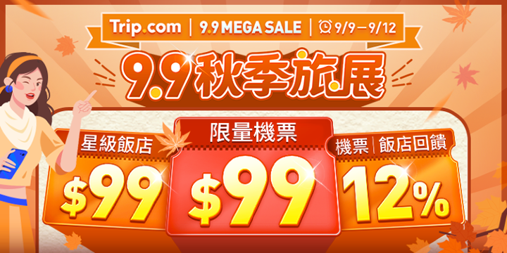 【2025年9月8日,台北訊】今年最狂教師節、中秋節、雙十節三大黃金連假來臨,全球領先的線上旅遊平台 Trip.com 推出限時4天「秋季旅展」,9 月 9 日起至9月12日於指定活動頁購買機票、住宿,最低享 99 元起銅板價,38種熱門景點門票、交通、eSIM、一日遊等票券,再享買一送一或半價優惠!同時,Trip.com瞄準秋季大型音樂盛典,IU、BLACKPINK等多位知名流行歌手與團體於日本、韓國、泰國演唱會即將開跑,祭出台灣、日本、韓國、泰國多家星級飯店,假日入住最高激省萬元;持Visa 商務卡卡友,可再於指定時間搶購單程直飛台北至大阪、札幌、清邁、首爾、普吉島等,日韓泰三國限量 999 元機票。不僅如此,Trip.com更霸氣推出優惠代碼、12% Trip Coins、預訂家庭出遊機票,享8折飯店、票券等三波好康優惠活動,數量有限,使用完為止。9月來Trip.com線上旅展預訂行程,迎接氛圍感十足的浪漫秋季旅遊。 (圖 1: Trip.com 限時4天秋季旅展開跑,9月9日至9月12日機票、住宿快閃驚喜優惠。) 9月9日至9月12日限時4天秋季旅展開跑,首發日機票、住宿超殺銅板價 黃金連假瘋旅遊,Trip.com 秋季旅展華麗登場! 9月 9 日首發日Trip.com祭出日本 [https://tw.trip.com/flights/cheap-flights-to-japan-78/]、泰國機票 [https://tw.trip.com/flights/cheap-flights-to-thailand-4/]與住宿超狂銅板價!中午 11 點搶先開賣,那霸水之都飯店、池袋陽光城王子飯店、札幌站前Forza飯店,以及2025新開幕,距離天神地下街步行5分鐘的福岡休雷克蓋特飯店等,交通位置極佳的星級飯店,每晚只要99 元起超值價格,平日每晚最高省6000元,假日更激省15000元;中午 12 點推出,單程直飛台北往東 [https://tw.trip.com/flights/taipei-to-tokyo/airfares-tpe-tyo/]京 [https://tw.trip.com/flights/taipei-to-tokyo/airfares-tpe-tyo/]、大阪 [https://tw.trip.com/flights/taipei-to-osaka/airfares-tpe-osa/]、曼谷 [https://tw.trip.com/flights/taipei-to-bangkok/airfares-tpe-bkk/]機票,只要 99 元,百元有找超划算。晚間 9 點30分,持Visa 商務卡卡友購買單程直飛台北往大阪、札幌 [https://tw.trip.com/flights/taipei-to-sapporo/airfares-tpe-spk/]、清邁 [https://tw.trip.com/flights/taipei-to-chiang-mai/airfares-tpe-cnx/],可享單人 999 元優惠價! 9月10日機票日與9月11日飯店日,假日住宿每晚激省7000元,超划算音樂追星新選擇! 秋日音樂盛典狂潮席捲全球,IU、YOASOBI、TWICE、BLACKPINK等多位知名日韓歌手與團體將於日本、韓國、泰國舉辦演唱會,還沒購買機票、住宿的迷粉們看過來。9 月 10 日機票日,中午 12 點販售單程直飛台北往首爾、釜山、濟州,單人 999 元機票。晚間9 點 30 分,持Visa 商務卡卡友購買單程直飛台北往首爾、濟州、曼谷、普吉島,可享單人 999 元優惠價。9 月 11 日飯店日,中午 12 點販售天空花園飯店明洞中心店 [https://tw.trip.com/hotels/seoul-hotel-detail-988513/hotel-skypark-central-myeongdong/] 、釜山萬楓飯店 [https://tw.trip.com/hotels/busan-hotel-detail-62286239/fairfield-by-marriott-busan-songdo-beach/] 、樂億皇家渡假酒店 [https://tw.trip.com/hotels/chiayi-city-hotel-detail-2488973/look-royal-resort/] 、品文旅礁溪 [https://tw.trip.com/hotels/yilan-hotel-detail-35597305/hotel-pin-jiaoxi/]、見潭璞旅 [https://tw.trip.com/hotels/taipei-hotel-detail-104677476/boutech-jiantan-hotel/] 、曼谷宜居飯店 [https://tw.trip.com/hotels/bangkok-hotel-detail-98984458/livable-hotel-bangkok/] 等熱門旅遊景點飯店,每晚 999 元優惠,平日每晚最高現省4000 元,假日現省近7000元,全台追星族想保留荷包購買紀念周邊趁現在! 9 月 12 日票券日,中午 12 點台灣、日本、韓國等地,38種限量票券、eSIM [https://tw.trip.com/guide/phone/esim.html] 、交通預訂優惠登場,包含胡志明市湄公河三角洲一日遊、暢玩關西高級通票1週、曼谷暹羅海洋世界門票等21種票券,享買一送一優惠;日本韓國泰國eSIM 、長灘島跳島遊與機場接駁、峴港出發巴拿山與金橋小團一日遊等12種票券半價;另有5種如香港機場快線電子票一口價優惠、 香港迪士尼樂園、日本環球影城等獨家優惠,多人同歡秋日旅行最好玩。 超大方三波好康活動,優惠代碼最高現賺3333元,家庭出遊再享飯店、票券8折優惠! 為讓全台Trip.com使用者玩得盡興,Trip.com加碼霸氣推出超狂三波優惠回饋活動。首波關注每日午間、晚間兩時段送出優惠代碼,9月9日首發日,中午12點30分釋出折抵333元,晚間10點釋出Visa卡友獨享折抵2222 元和 1111 元的機票、飯店優惠代碼;9月10日中午12點30分釋出折抵333元、泰國機票與泰國機加酒5折優惠代碼,晚間10點釋出折抵 1111 元和 333 元的限量機票優惠代碼;9月11日中午12點30分釋出折抵333元,晚間10點釋出折抵 1111 元和 333 元的限量飯店優惠代碼,數量有限,使用完為止。其次為晚間 10 點至 晚間11點 59分期間,預訂日本、韓國、泰國機票可享額外 12% Trip Coins 回饋。最後,瞄準親子旅遊需求,Trip.com今年首度推出「家庭出遊優惠」,秋季旅展期間於活動頁點擊「立即參加」,預訂一張含2位乘客以上的指定地點(台灣出發至東京、大阪、沖繩、首爾、釜山、上海、香港、曼谷)機票,付款成功後可一次獲得飯店與票券的8折優惠代碼。另外針對租車需求,也祭出限量最高 租車 [https://tw.trip.com/carhire/] 半價優惠券。從交通、住宿到租車,Trip.com通通一站式預訂包辦,誓要成為你黃金連假的最佳旅遊玩伴,讓你玩好玩滿享受度假美好,詳情可參考Trip.com秋季旅展活動頁。 【秋季旅展】 l 秋季旅展機票、住宿、票券預購:https://reurl.cc/6qVGbd 【關於Trip.com