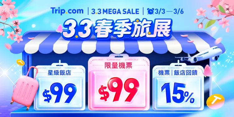 全球領先的線上旅遊平台Trip.com推出限時四天春季旅展(3月3日至3月6日),重磅祭出單程直飛日本東京、大阪、沖繩的機票一口價99元,沖繩四星飯店每晚99元起,千元折扣碼天天送,還有預訂日本及中國大陸機票再加碼享 Trip Coins 10%回饋、飯店享15%回饋,絕不能錯過這波春季最強優惠! 日本是台灣旅客長年最愛的旅遊目的地,每年 3 月 15 日至 4 月 15 日是日本傳統的櫻花節,又稱櫻花祭,有超過 340 種櫻花競相綻放,從繁華都市到寧靜小鎮都為迎接「櫻花祭」的各項活動而熱鬧起來。根據日本氣象局2月最新公布的櫻花開花預測,今年日本櫻花預計自3月22日起逐漸盛開。Trip.com貼心準備各項日本機票、飯店超值優惠,把握在這個最美的季節,讓您輕鬆遊日本,在粉色花海中盡享春日浪漫。 3/3 週一狂歡日:日本機票飯店下殺99元,千元折扣碼大方送 Trip.com 春季大促銷開跑首日祭出超殺優惠: * 限時飯店優惠 :3月3日上午11點,將開賣日本沖繩那霸安迪魯飯店高級雙床房每晚下殺99元起,銅板價入住四星級飯店,欣賞那霸港港口美景,直接拿下CP值之王。同時段也開放預訂精選飯店,雙人房房型全部下殺每晚999元起,包括:位於京都市中心的八條都飯店、名古屋的無敵景觀飯店JR門樓飯店、從水族館到電影院應有盡有的東京品川王子大飯店,以及地鐵一站直達上海迪士尼樂園、提供免費樂園接駁車的上海客萊福諾富特飯店。 * 限時機票優惠:3月3日中午12點,準時開放搶購台北直飛日本東京、大阪、沖繩的單程機票,全部一口價只要99元,僅此一天,售完為止。 * 限時優惠代碼:3月3日晚上10點,再加碼釋出折抵2,222元和1,111元的機票、飯店優惠代碼,目的地不限但數量有限,先搶先贏! * Trip Coins加碼送:3月3日和4日限定兩天每晚9點至凌晨12點期間,預訂日本機票享10% Trip Coins回饋。3月3日至6日四天全時段,預訂日本及中國大陸飯店皆享15% Trip Coins回饋、中國大陸機票享10% Trip Coins回饋。 3/4 週二機票日:上海、成都來回機票一口價1,999元 3月4日中午12點開賣限量優惠機票,台北直飛上海、成都來回機票都只要一口價1,999元,再送10% Trip Coins回饋。當日晚上10點,將加碼釋出折抵1,111元和333元的限量機票優惠代碼,不限目的地,全球航班都適用! 此外,Trip.com 為白金等級以上會員,提供免費使用機場貴賓室的福利(依預訂航班的出發機場或航廈有合作之貴賓室情況為準),讓您的旅程更舒適。 3/5 週三飯店日:台灣專場,精選五星飯店1,999元起 Trip.com 台灣飯店優惠專場將在3月5日中午12點開跑,精選五星飯店優惠包括:位於熱鬧中山區、豪華典雅的台北美麗信花園飯店,以及鄰近台北新地標雙子星大樓,擁有絕佳高樓景觀的台北凱達大飯店,豪華雙人房房型都限時優惠每晚1,999元起。此外,坐落於台南老城區中心,以質感設計與跨界品牌合作掀起話題的生活風格旅店台南友愛街旅館,友緻客房限時優惠每晚1,999元。 5日晚上10點,將釋出折抵1,111元和333元的限量飯店優惠代碼,最後機會,敬請把握! 3/6 週四票券日:亞洲人氣景點門票買一送一,eSIM卡半價 3月6日中午12點,將開放亞洲熱門景點體驗門票「買一送一」優惠,包括:日本環球影城、韓國首爾塔、香港海洋公園、越南富國島珍珠遊樂園、泰國清邁野生動物園夜遊、印尼峇里島海豚樂園、花蓮遠雄海洋公園、賞鯨體驗等等。同時加上多項亞洲地區eSIM卡半價優惠,助您輕鬆解鎖人氣景點,把握春季出遊的美好時光。