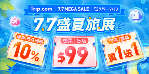 【2025年7月7日,台北訊】-暑假旅遊狂潮來襲,全球領先的線上旅遊平台 Trip.com 推出快閃4天「盛夏旅展」, 7 月 7 日起至7月10日於指定活動頁購買機票、住宿,最低享 99 元起銅板價,台灣、日本、韓國多家星級飯店,假日入住最高激省9000元,多種景點門票另享買一送一優惠。持Visa 商務卡卡友可再於指定時間搶購單程直飛台北至東京 [https://tw.trip.com/flights/taipei-to-tokyo/airfares-tpe-tyo/]、福岡 [https://tw.trip.com/flights/taipei-to-fukuoka/airfares-tpe-fuk/]、札幌 [https://tw.trip.com/flights/taipei-to-sapporo/airfares-tpe-spk/]、首爾 [https://tw.trip.com/flights/taipei-to-seoul/airfares-tpe-sel/]、釜山 [https://tw.trip.com/flights/taipei-to-busan/airfares-tpe-pus/]等日韓國家限量 999 元機票。7 月 7 日起至7月9日Trip.com更加碼釋出機票、飯店優惠代碼雙重奏,單日最高可獲得3333元折抵金額,數量有限,使用完為止。此外,一年一度的澎湖花火節 [https://tw.trip.com/guide/destination/%E6%BE%8E%E6%B9%96%E8%8A%B1%E7%81%AB%E7%AF%80.html] 將於7月29日閉幕,Trip.com也祭出住宿 [https://tw.trip.com/hotels/]、租車 [https://tw.trip.com/carhire/] 預訂85折起優惠,熱門住宿最狂可現省2500元。7月來Trip.com線上旅展預定行程,Fun心開啟盛夏旅遊派對,暑假旅遊Chill嗨嗨。 (圖 1: Trip.com 限時4天盛夏旅展開跑,7月7日至7月10日機票、住宿快閃驚喜優惠。) 限時4天盛夏旅展開跑,7月7日至7月10日機票、住宿快閃驚喜優惠價 瞄準暑假旅遊熱,Trip.com 盛夏旅展快閃登場! 即日起至 7 月 10 日連續 4 天,日日機票 [https://tw.trip.com/flights/]、飯店、門票都有限時限量驚喜優惠價,不怕旅遊旺季無處玩!7 月 7 日首發日台灣、日本、韓國多個超值飯店、機票限定優惠秒殺登場。中午 11 點搶先開賣,高雄互舍飯店 [https://tw.trip.com/hotels/kaohsiung-hotel-detail-907030/kaohsiung-h-house/]、 富野溫泉休閒會館 [https://tw.trip.com/hotels/taitung-hotel-detail-1204635/hoya-hot-spring-resort-and-spa/] 、新北趣淘漫旅 [https://tw.trip.com/hotels/new-taipei-city-hotel-detail-10606587/hotel-cham-cham-taipei/] ,以及JR九州Blossom飯店那霸 [https://tw.trip.com/hotels/naha-hotel-detail-7420938/jr-kyushu-hotel-blossom-naha/] 、三井花園飯店名古屋普米爾 [https://tw.trip.com/hotels/nagoya-hotel-detail-5086203/mitsui-garden-hotel-nagoya-premier/] 、福岡中洲布瑞克法斯特飯店 [https://tw.trip.com/hotels/fukuoka-hotel-detail-15156896/hotel-wbf-fukuoka-nakasu/] 等六家星級飯店,每晚只要99 元起超殺價格,平日每晚最高省4000元,假日更激省9000元;中午 12 點推出,單程直飛台北往大阪 [https://tw.trip.com/flights/taipei-to-osaka/airfares-tpe-osa/]、沖繩 [https://tw.trip.com/flights/taipei-to-okinawa/airfares-tpe-oka/]、名古屋 [https://tw.trip.com/flights/taipei-to-nagoya/airfares-tpe-ngo/],也只要 99 元銅板價。晚間 9 點30分,持 Visa 商務卡卡友購買單程直飛台北往東京、福岡、札幌,可享單人 999 元優惠價。 另外針對暑假旅遊需求,祭出租車半價優惠券,適用於租車 3 日以上旅客,折扣金額上限為 660 元,同時於指定城市租車(台北 [https://tw.trip.com/carhire/to-china-1/taipei-617/]、澎湖 [https://tw.trip.com/carhire/to-china-1/penghu-7805/]、高雄 [https://tw.trip.com/carhire/to-china-1/kaohsiung-720/]、花蓮租車 [https://tw.trip.com/carhire/to-china-1/hualien-6954/])亦可享特定折扣優惠,兩項優惠可雙重疊加使用。 (圖 2: Trip.com盛夏旅展7月7日首發日,飯店、機票一口價99元起。) 7 月 8 日機票日,中午 12 點30分販售單程直飛台北往上海 [https://tw.trip.com/flights/taipei-to-shanghai/airfares-tpe-sha/]、重慶 [https://tw.trip.com/flights/taipei-to-chongqing/airfares-tpe-ckg/]、廣州 [https://tw.trip.com/flights/taipei-to-guangzhou/airfares-tpe-can/],單人 999 元機票。晚間9 點 30 分,持Visa 商務卡卡友購買單程直飛台北往首爾、釜山、濟州 [https://tw.trip.com/flights/taipei-to-jeju/airfares-tpe-cju/],可享單人 999 元優惠價。7 月 7 日和7 月 8 日限定兩天,晚間 9 點至凌晨 12 點期間,預訂台灣飯店以及日本、韓國機票可享額外 10% Trip Coins 回饋。 7 月 9 日飯店日,中午 12 點販售首爾 HOMES Stay 明洞 [https://tw.trip.com/hotels/seoul-hotel-detail-108411380/homes-namsan/]、釜山霍默斯飯店 [https://tw.trip.com/hotels/busan-hotel-detail-1171946/homers-hotel-busan/] 、和頤至尊飯店等熱門旅遊景點飯店,每晚 999 元優惠,平日每晚最高現省近 6000 元,假日現省近8500元。不僅如此,此次Trip.com更於7月7日至7月9日,加碼祭出優惠代碼雙重奏。第一重奏為中午12點30分折抵333元的機票、飯店優惠代碼,其次為7月7日晚間10點,釋出折抵 2222 元和 1111 元的機票、飯店優惠代碼, 7月8日晚間10點,釋出折抵 1111 元和 333 元的限量機票優惠代碼,以及7月9日晚間10點,釋出折抵 1111 元和 333 元的限量飯店優惠代碼,數量有限,使用完為止! (圖3:7 月 9 日飯店日,中午 12 點販售熱門旅遊景點飯店,每晚 999 元優惠。) 7 月 10 日票券日,中午 12 點台灣、日本、韓國等地,8種限量買一送一票券,獨家預訂優惠登場,包含阿倍野展望台 [https://tw.trip.com/travel-guide/attraction/osaka/abeno-harukas-300-observatory-29998779/] 、沖繩美麗海水族館 [https://tw.trip.com/guide/attraction/%E6%B2%96%E7%B9%A9%E7%BE%8E%E9%BA%97%E6%B5%B7%E6%B0%B4%E6%97%8F%E9%A4%A8%E9%96%80%E7%A5%A8.html] 、三麗鷗彩虹樂園 [https://tw.trip.com/travel-guide/attraction/tama/sanrio-puroland-10759099/]、 韓國猛男秀 [https://tw.trip.com/guide/attraction/%E9%9F%93%E5%9C%8B%E7%8C%9B%E7%94%B7%E7%A7%80%E9%96%80%E7%A5%A8.html] 、鹿芝谷 [https://tw.trip.com/travel-guide/attraction/nantou/deer-valley-14961837