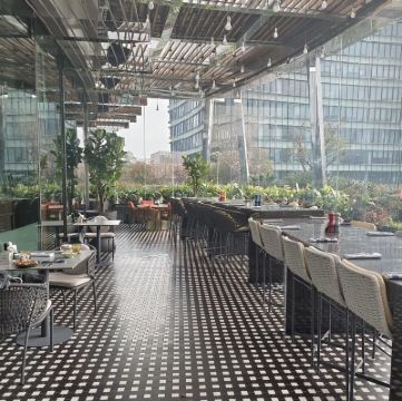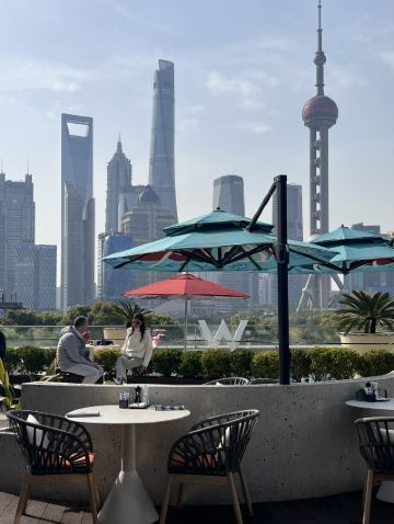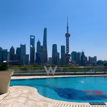 網紅餐廳,風景極佳。室內餐桌照出去,近景露天紅色涼棚,中景W標誌的無邊泳池,遠景陸家嘴高樓群和東方明珠電視塔盡收眼底。下午茶性價比很高,茶壺器皿精緻講究,馬卡龍軟硬兼備糖度適中,蝴蝶酥酥脆柔韌,味道正宗。W酒店門廊藻井裝潢一如既往的個性十足,很有特色。
