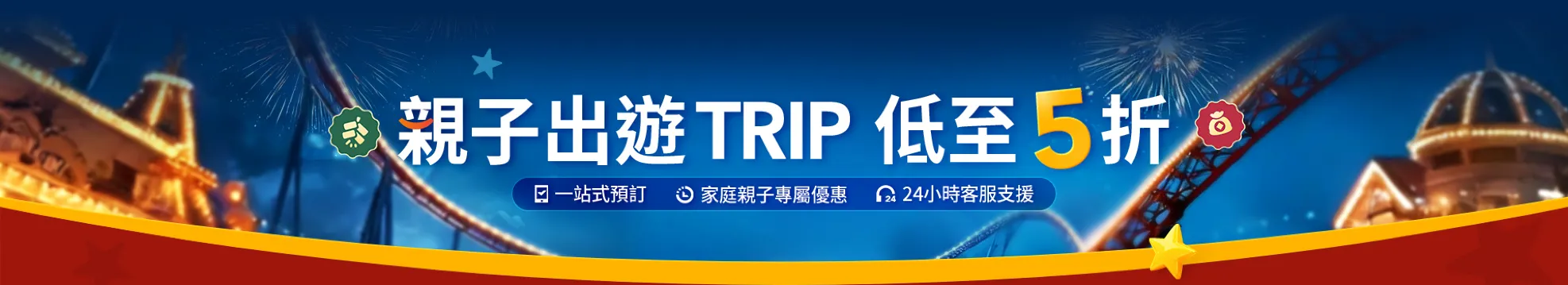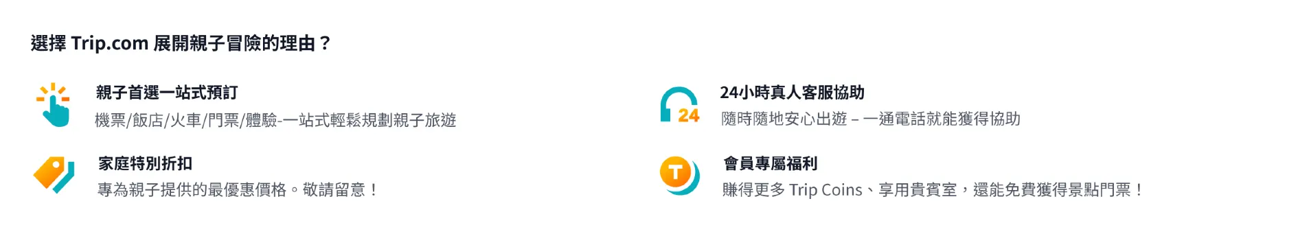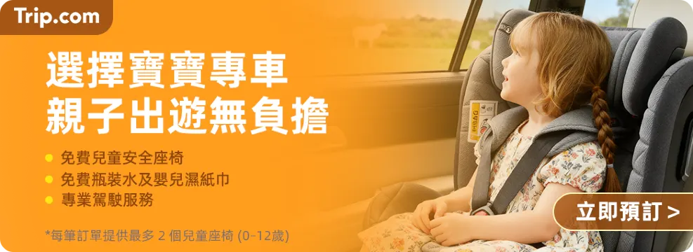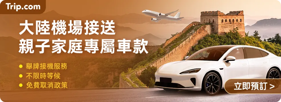 親子旅遊優惠代碼規則 1. 發放時間:活動期間每逢週一的 10:00 整,均發放機票優惠代碼 (最高 NT$600 折扣)、飯店優惠代碼 (最高 NT$300 折扣;最高 NT$1000 折扣)、當地體驗優惠代碼 (NT$50 折扣;NT$100 折扣)。當地體驗 5% 優惠代碼、租車優惠代碼、機場接駁優惠代碼,均於 10 月 15 日發放。所有優惠代碼數量有限,先搶先贏。 2. 親子旅遊專享優惠代碼的使用及庫存限制 航班累進優惠代碼:若要取得折扣,您的訂單須有至少 2 位乘客,且總金額須達到相應的累進折扣門檻。如需了解具體的累進折扣資訊,請參閱優惠代碼詳情。 飯店優惠代碼: 3 晚優惠代碼:您必須連續入住至少 3 晚,且訂單總額須達到規定金額,方可使用此優惠代碼,享受累進折扣。 週末度假優惠代碼:若要使用累進折扣,您的訂單必須符合下列條件:至少入住 1 晚、週五至週日期間入住及退房,且應付金額須達到累進折扣門檻。 當地體驗優惠代碼 (NT$50 折扣;NT$100 折扣):部分特定當地體驗產品不符合條件。優惠代碼將自動套用至訂單頁面上符合條件的產品。未能自動套用優惠代碼的產品,即不符合此優惠條件。 其他類型優惠代碼的詳細規則,請參閱「專享優惠」內各優惠代碼的附加條款。 3. 此親子旅遊活動僅適用於 Trip.com 會員。每筆訂單限用 1 組優惠代碼;每位會員的每組優惠代碼限用 1 次。 4. 相關優惠數量有限,以「先搶先贏」原則為準。 5. 每組優惠代碼限領取且使用 1 次,且不可搭配使用其他優惠、活動或折扣。 6. 親子旅遊優惠代碼不可轉讓,也不可兌換現金。 7. Trip.com 保留權利以隨時變更或取消本活動或其條款及細則,恕不另行通知;另亦保留所有最終解釋權。參加本活動,即代表您同意 Trip.com 親子旅遊優惠條款及細則。