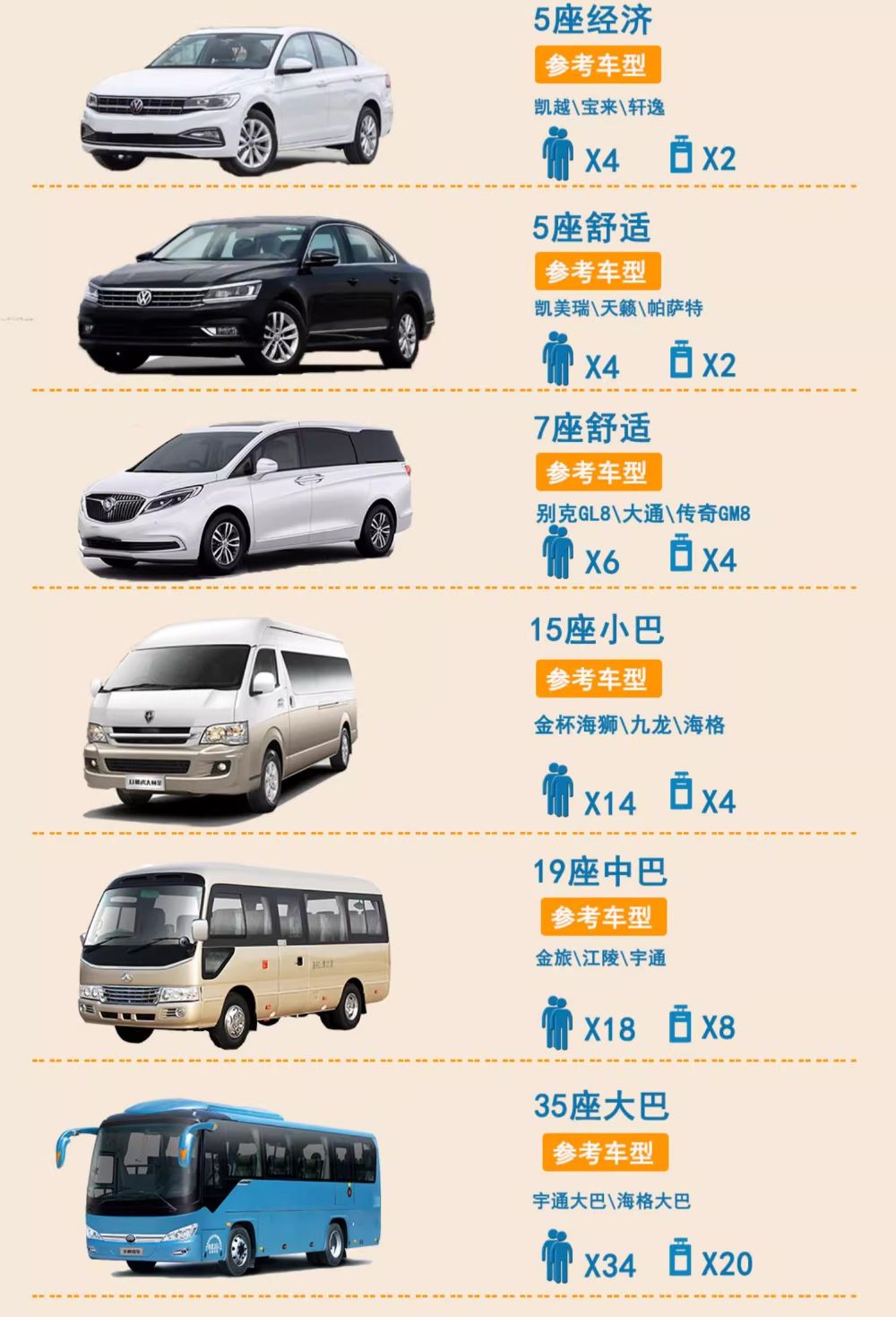 5 人座標準車型、5 人座舒適車型、7 人座中型廂型車