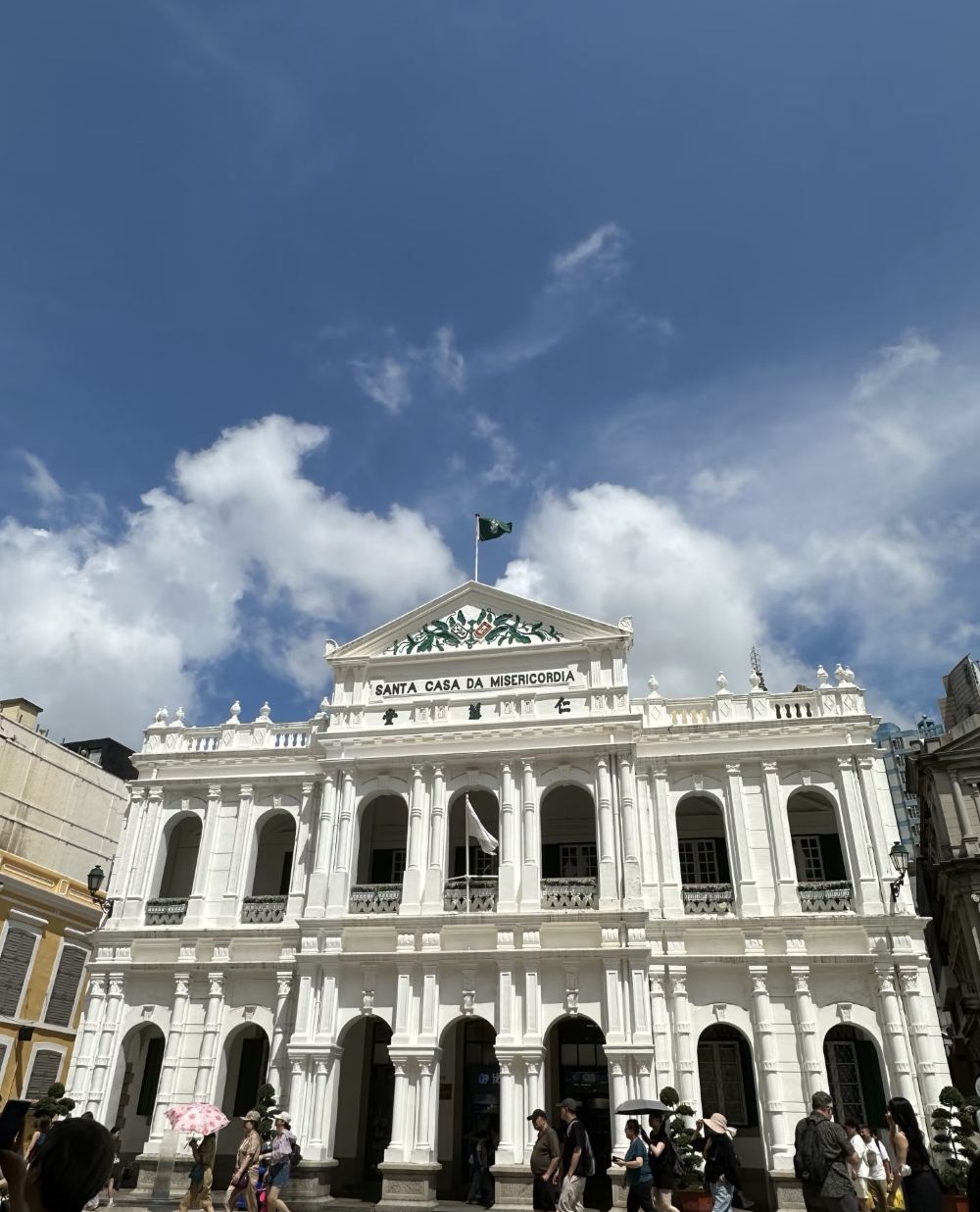 議事亭前地:經典的葡式黑白碎石地面,周圍環繞著色彩鮮豔的歐式建築,如民政總署大樓、仁慈堂等。