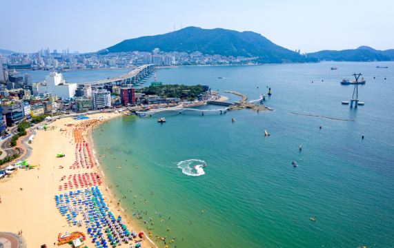 ▲ [海雲台藍線公園] 以悠閒的速度在海面上空前行,是打卡拍照和情侶約會的浪漫體驗。