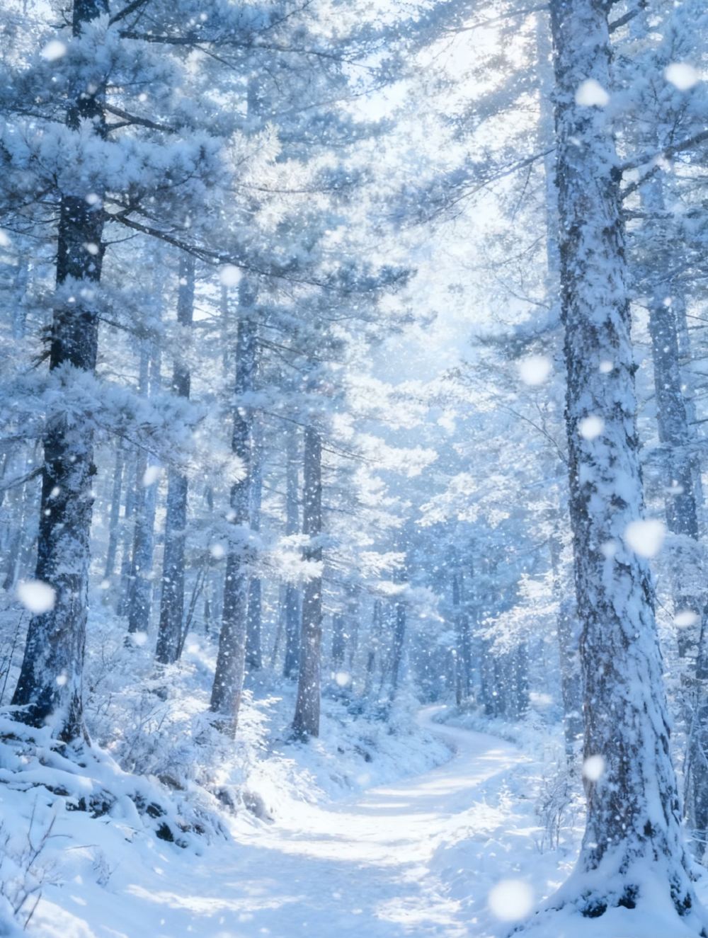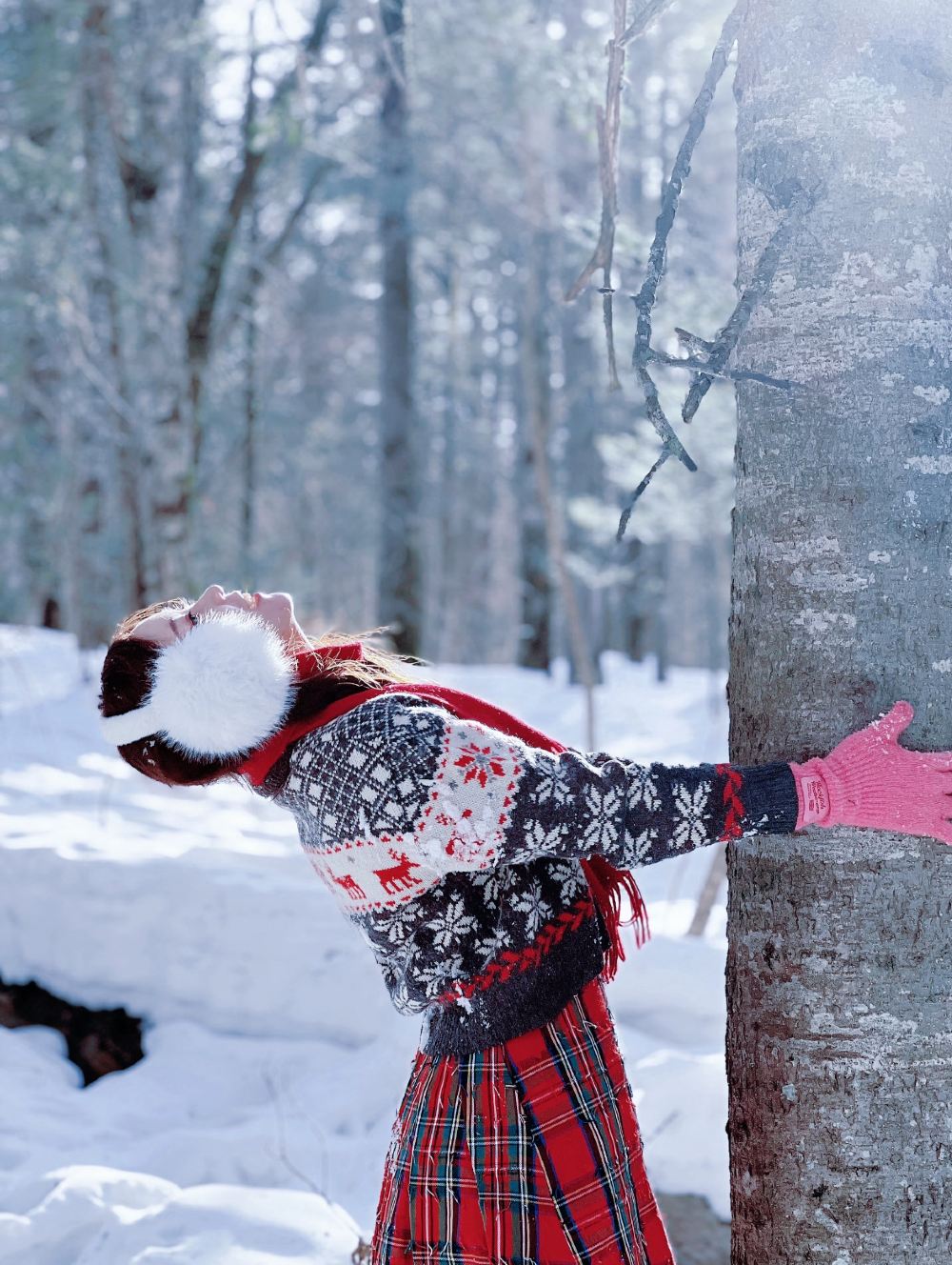 ▲ 林深處的雪裹著靜,圍巾的彩線在白裡漾開,連風都輕了半分。