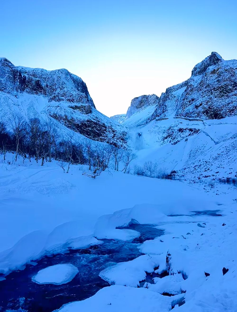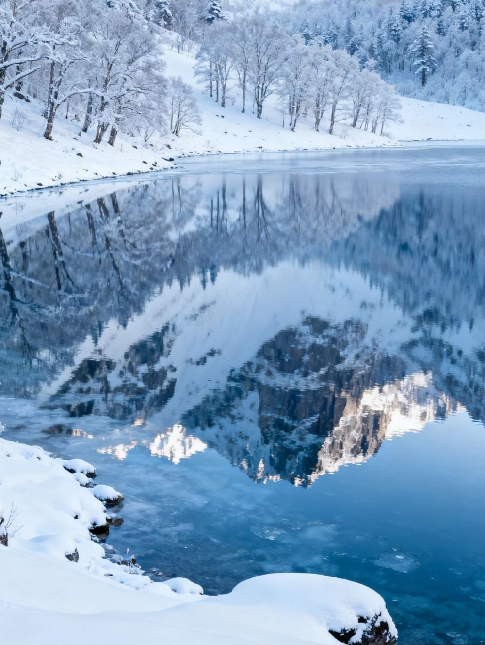 ▲ 冰湖裹著冷藍,雪枝與山影在水裡織了幅對稱的夢,連時光都慢成了留白。