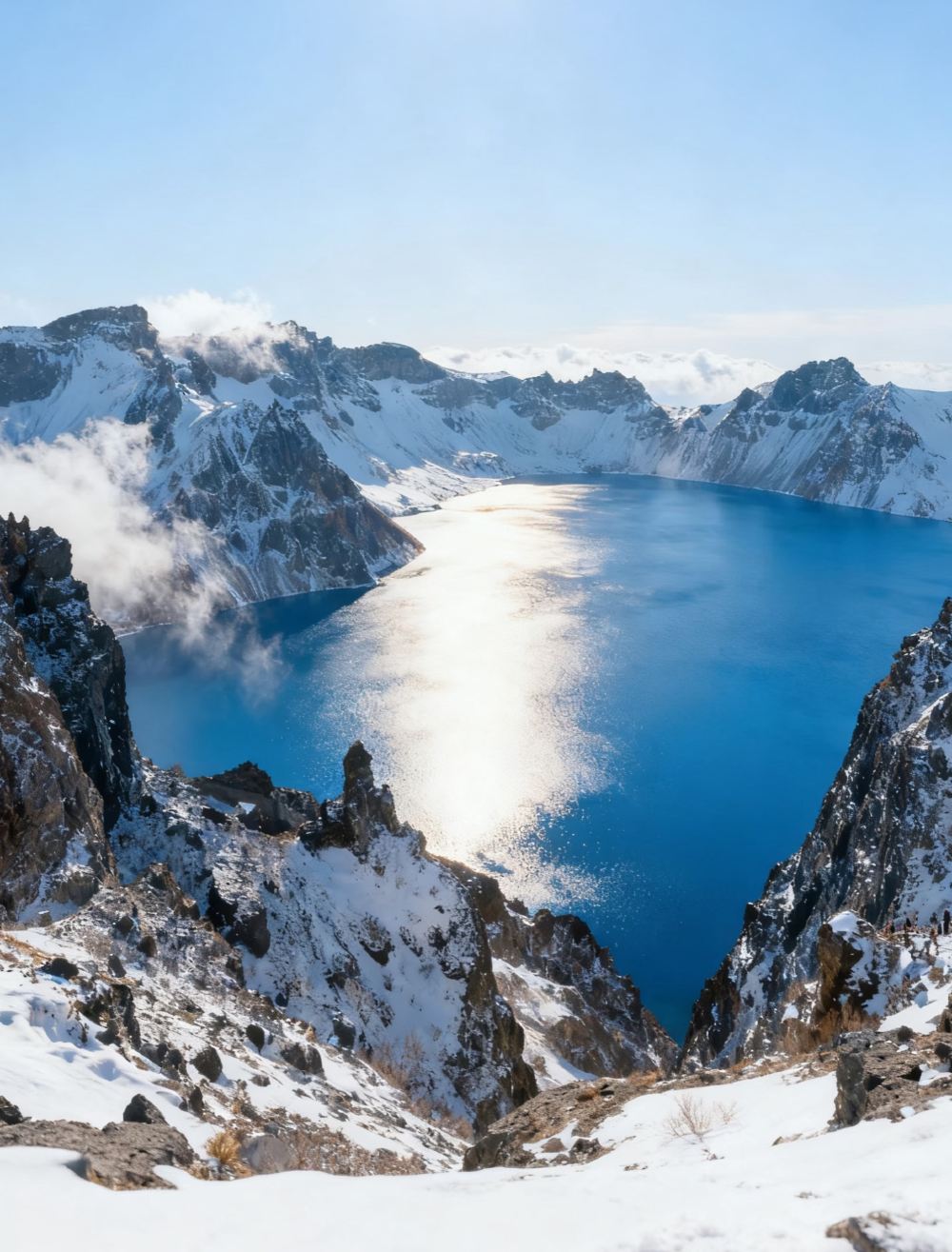 ▲ 雪覆林梢時,湖面將山與樹都折進藍鏡裡,連冬風都輕得不敢撞碎這方靜。
