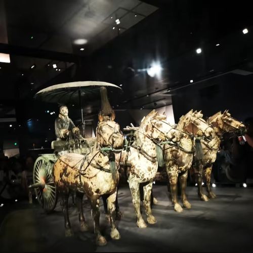 ▲ 青銅車馬:古代科技聚焦「青銅之冠」的工藝 —— 導覽車馬傘「遮陽 + 避雨 + 防禦」三重功能,車輪青銅轂的潤滑技術,以及金銀錯紋飾的象徵意義,還原秦代的智慧