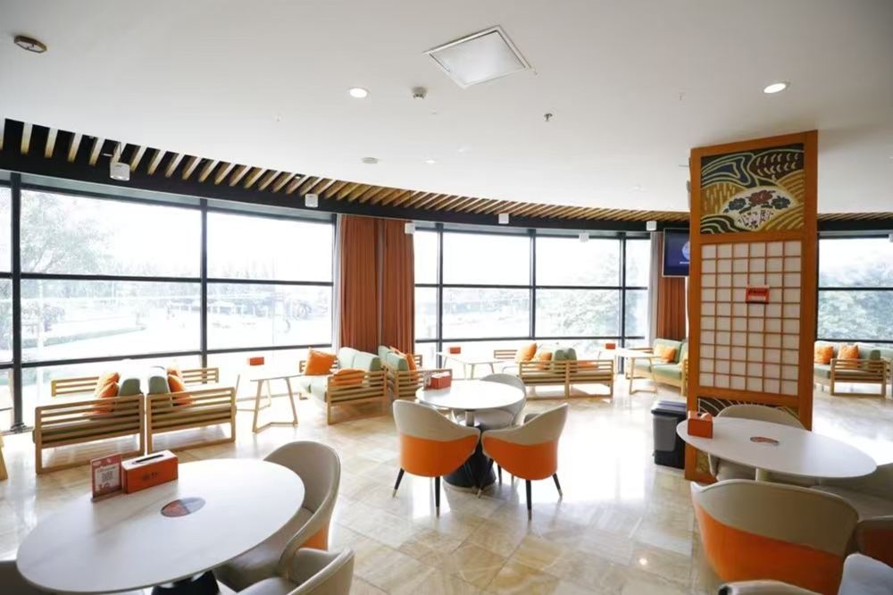 - 休閒區,大窗採光佳,擺放橙白配色桌椅和木藝沙發,日式屏風裝飾,空間明亮舒適