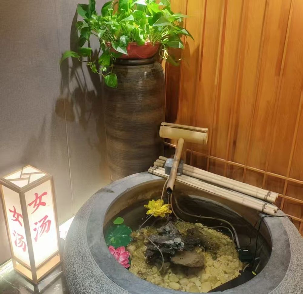 - 女湯區域,石製水缽,竹製流水裝置,綠植點綴,燈籠標識「女湯」,風格雅緻