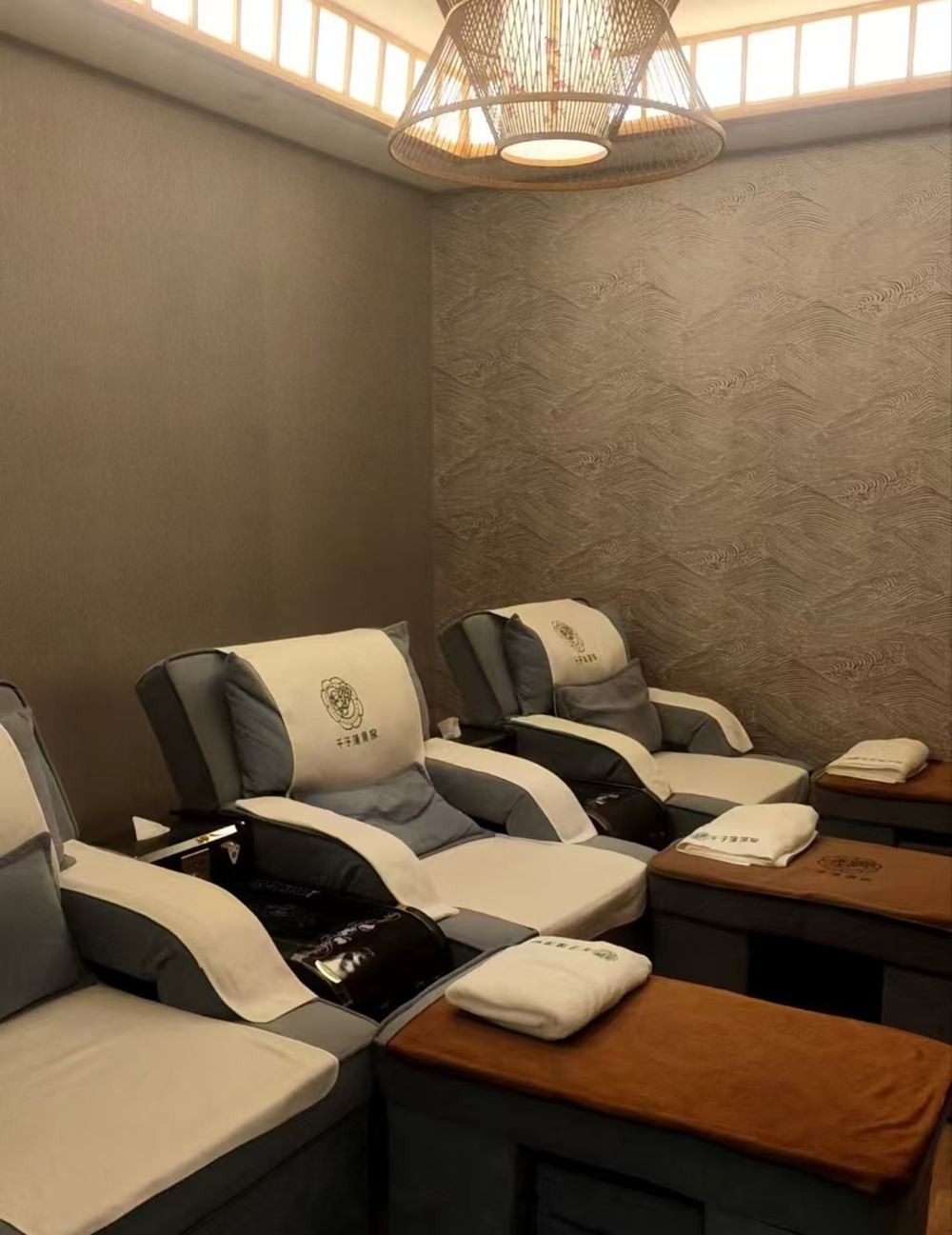 - 足療區,灰色按摩椅搭配白色巾品,牆面紋理獨特,頂部燈具精美,盡顯舒適