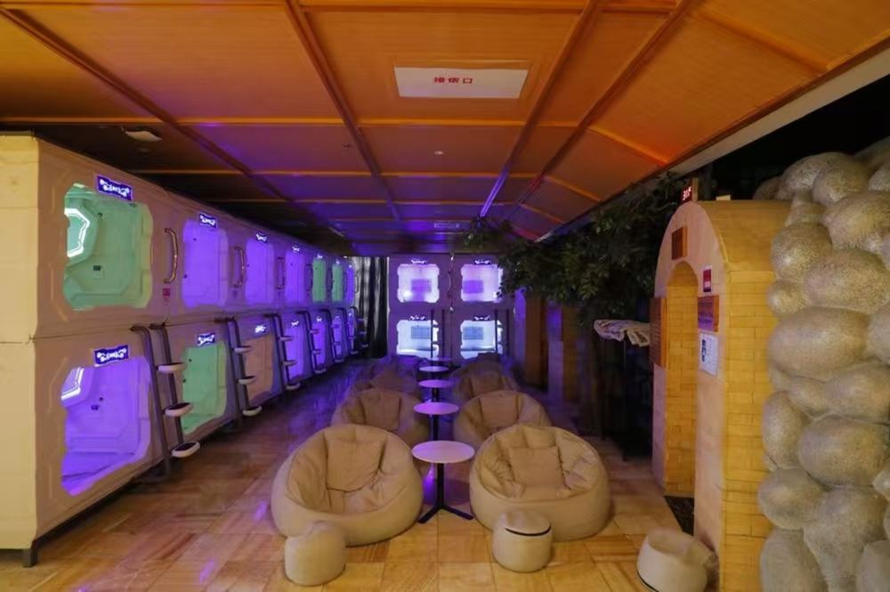 - 休閒區設有膠囊式休息艙、豆袋椅,以及仿石洞穴門,燈光營造科技感