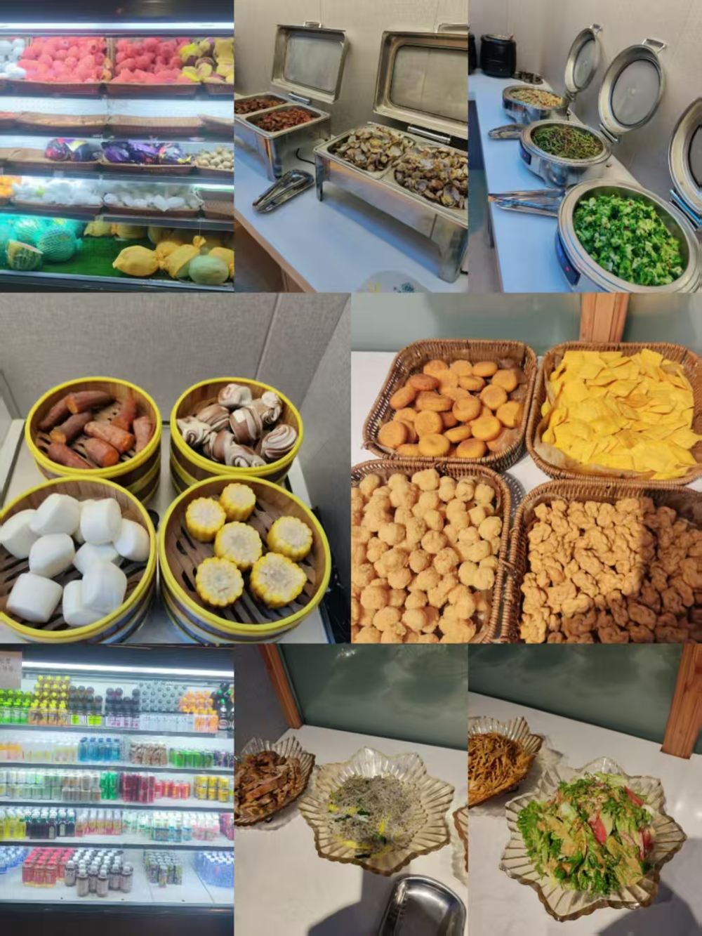 - 自助區,提供現切水果、海鮮、蒸點、飲品、油炸小吃、熱菜沙拉等,種類豐富多樣
