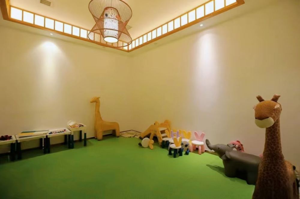 - 兒童遊樂區,綠色地墊,有長頸鹿等動物玩具、小桌椅和玩具,頂部燈具別緻
