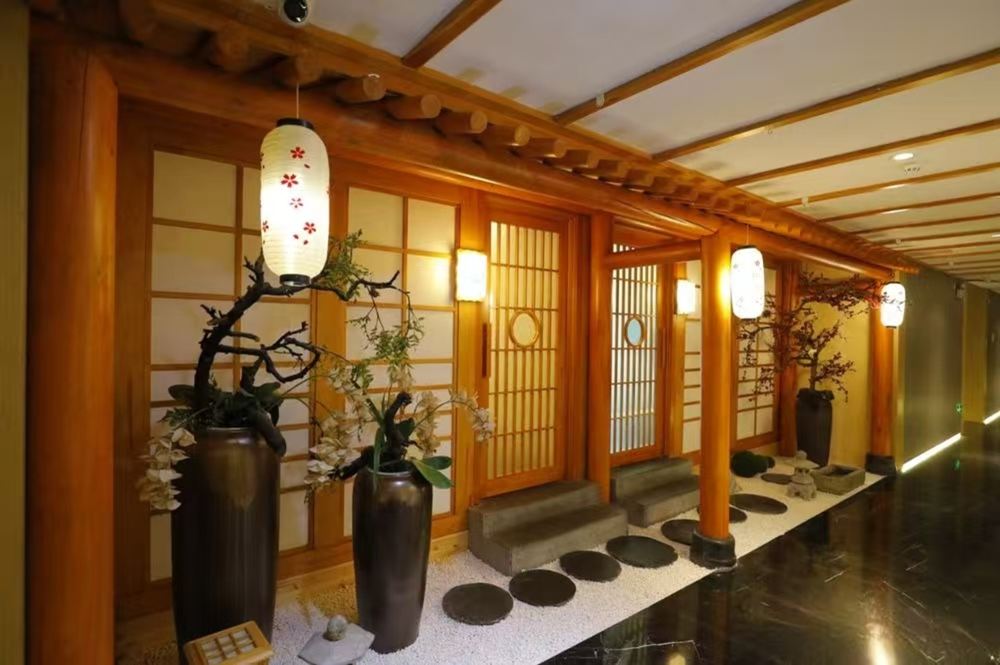 - 門店以「日式和風」為核心設計語言,原木色地板與暖黃色燈光交織出溫潤基調,入口處的枯山水景觀搭配潺潺流水聲,瞬間將人引入鬆弛狀態