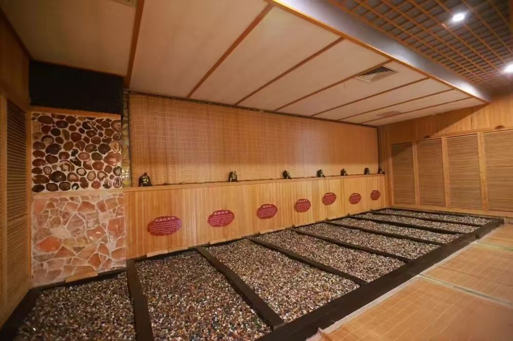 - 汗蒸房,鋪滿彩色石子,牆面有竹簾和裝飾石,配多個小佛像,風格古樸