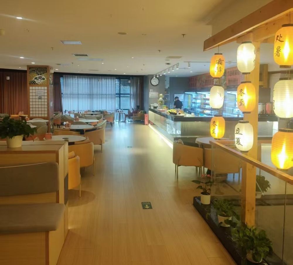 - 餐廳,淺木色地板,桌椅整齊,燈籠標有節氣,餐台後有工作人員,氛圍溫馨