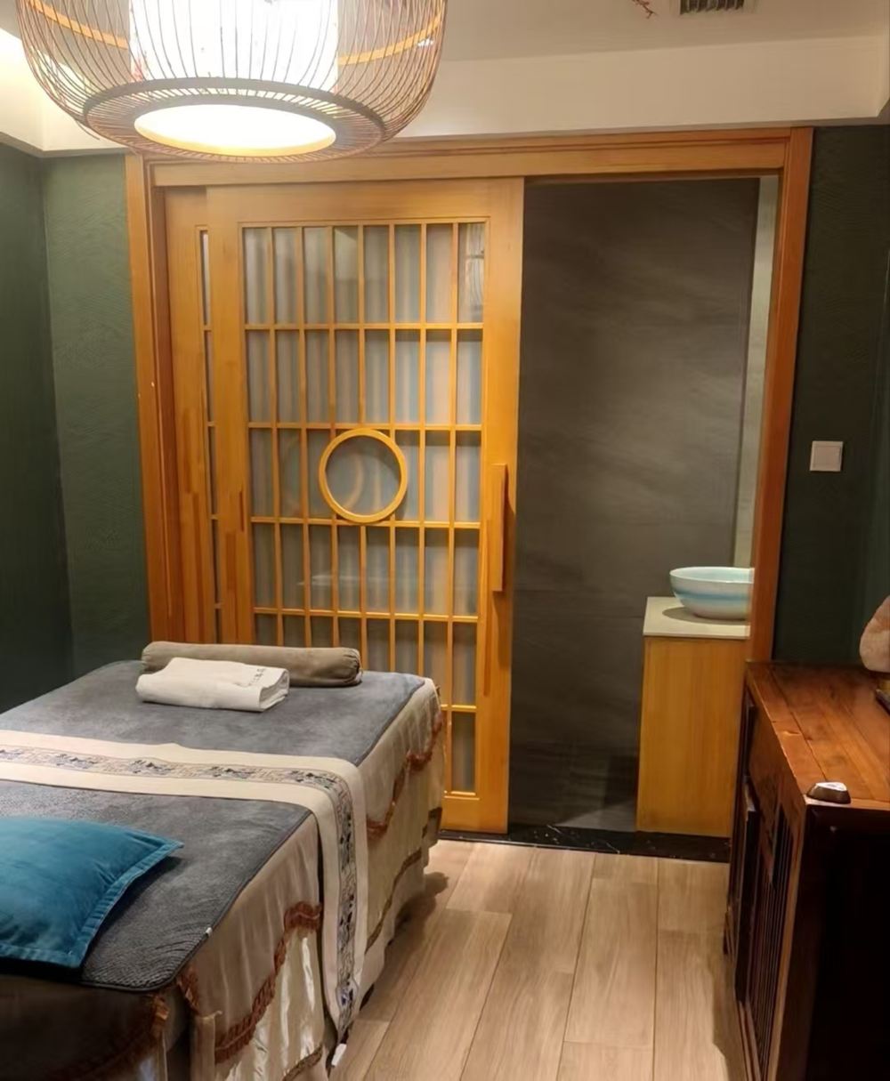 - 按摩室,日式拉門,按摩床配備毛巾,頂部燈具獨特,角落洗手台設計雅緻
