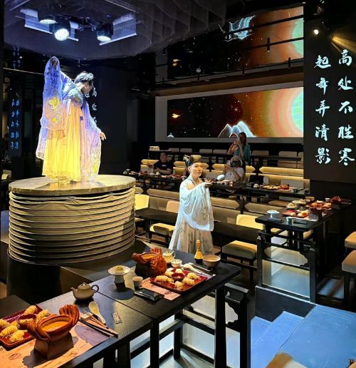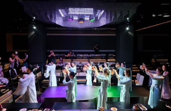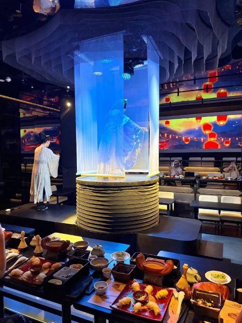 - 中央舞台上,《踏歌》《蟹戲蓮間》等國風舞蹈定時上演,水袖翻飛間煙霧繚繞,配合古琴師彈奏的《平沙落雁》,彷彿將北宋文人的宴飲場景搬進了外灘樓宇