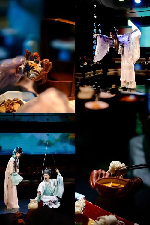 - 在食客品嚐蟹黃麵時,舞蹈《蟹戲蓮間》同步上演,舞者模仿蟹的姿態輕盈跳躍,與菜餚主題呼應,視覺與味覺雙重享受