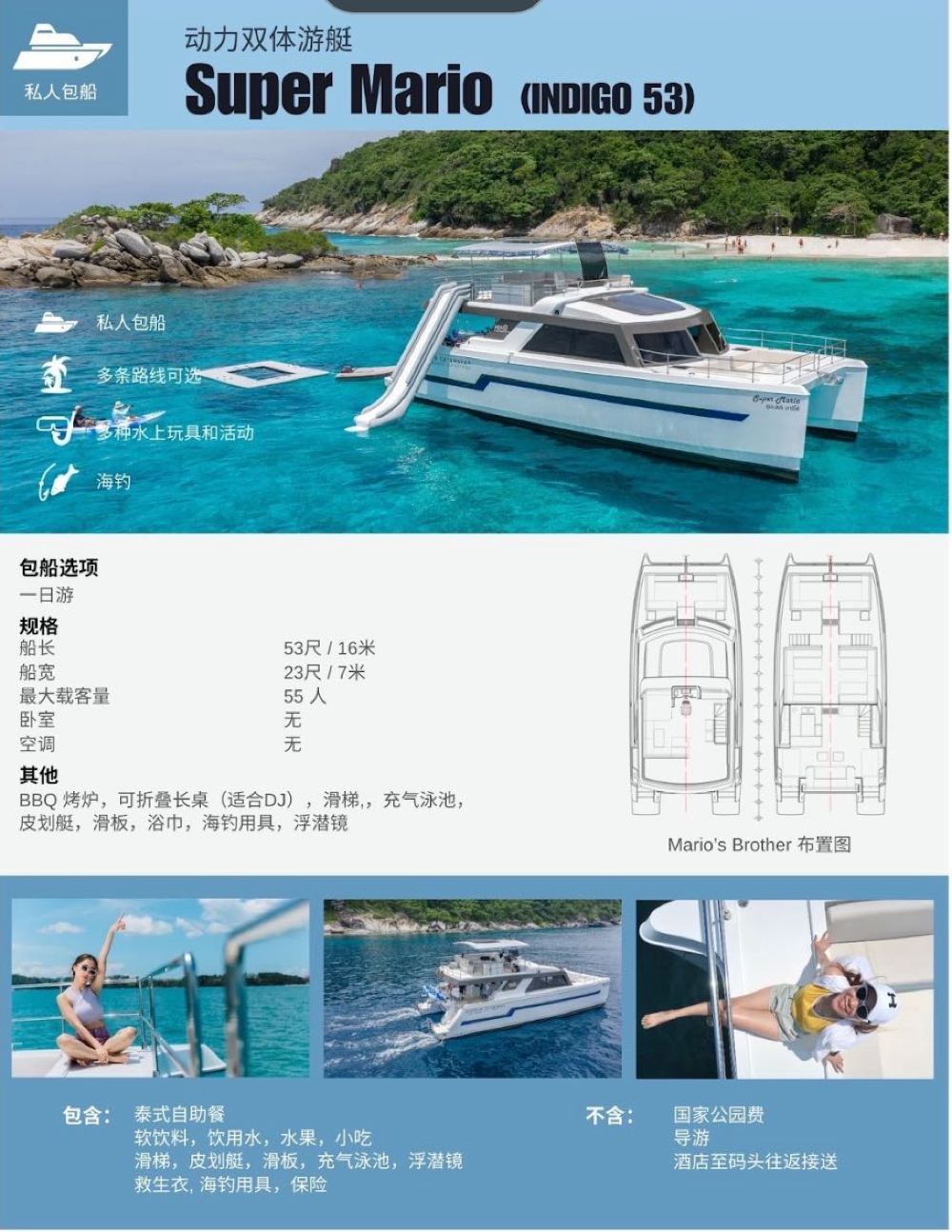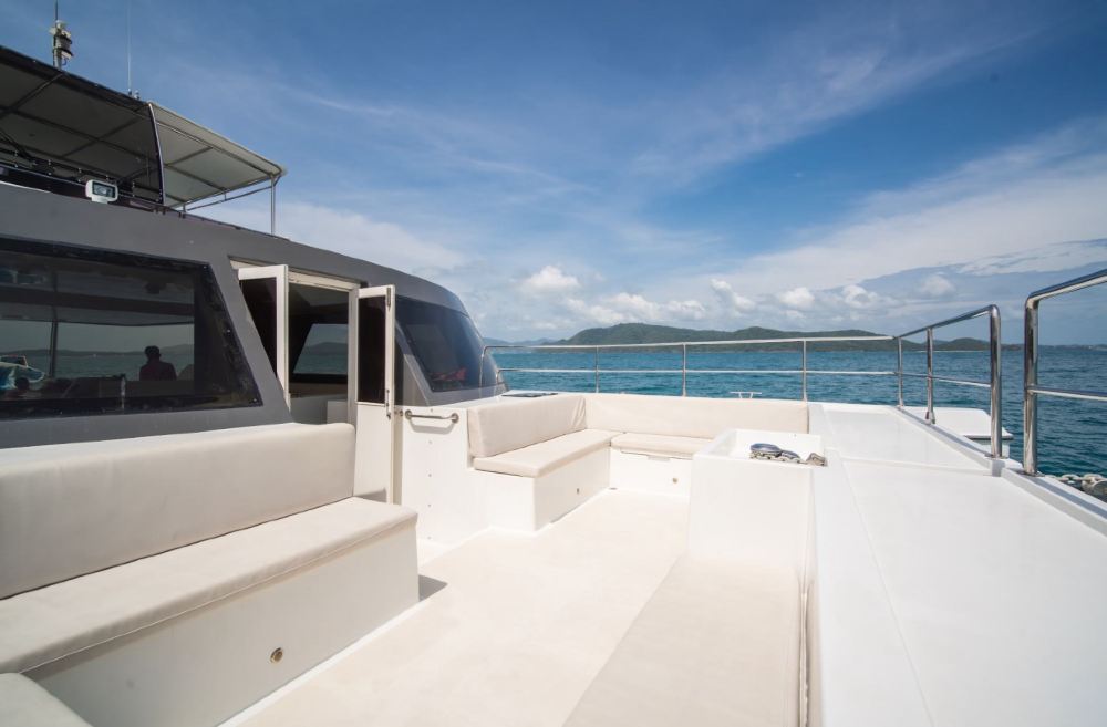 這艘53英尺「超級瑪利歐」雙體遊艇,是您普吉島包船出海的理想之選。寬敞空間適合聚會,提供海釣、飲料與小吃,帶您盡享海島的悠閒與樂趣。