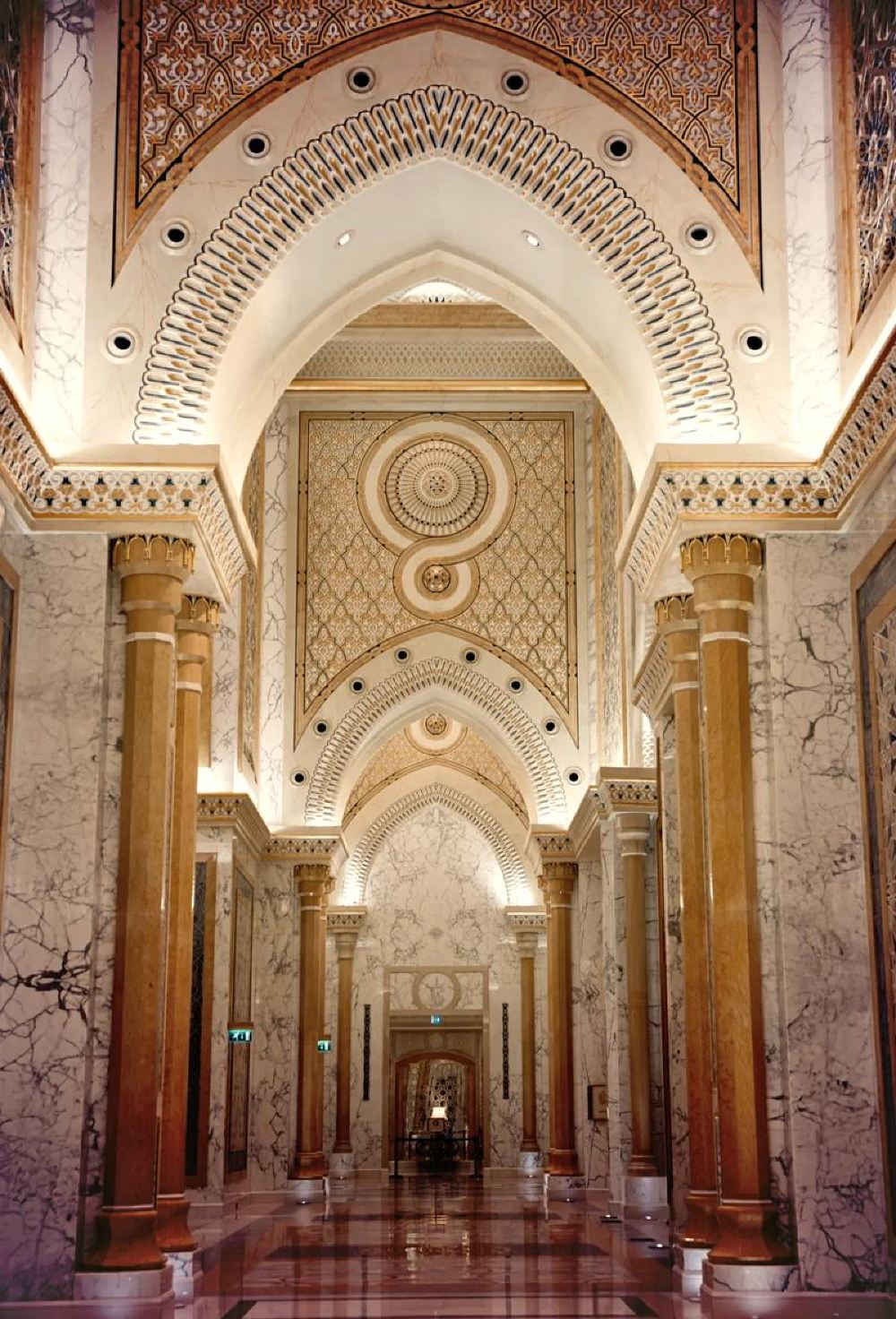 ▲ 黃金穹頂下的知識聖殿:中央大廳150公尺穹頂鑲嵌350萬片金葉,穹頂之下懸掛7噸水晶吊燈如星辰墜落。