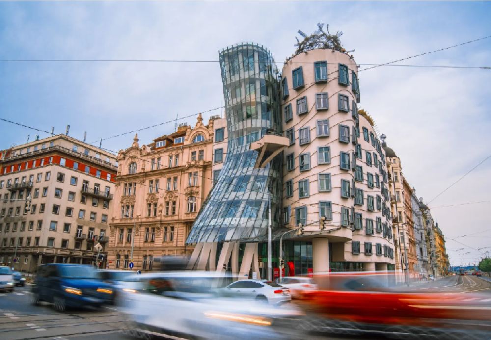 ▲ 跳舞的房子本名尼德蘭登國家保險大樓,是布拉格新城區的標誌性前衛建築,它由知名建築師布拉多·米盧尼奇和弗蘭克·蓋里聯手設計,自1996年建成以來,其扭曲「舞動」的造型早已成了伏爾塔瓦河畔一道亮麗的風景。