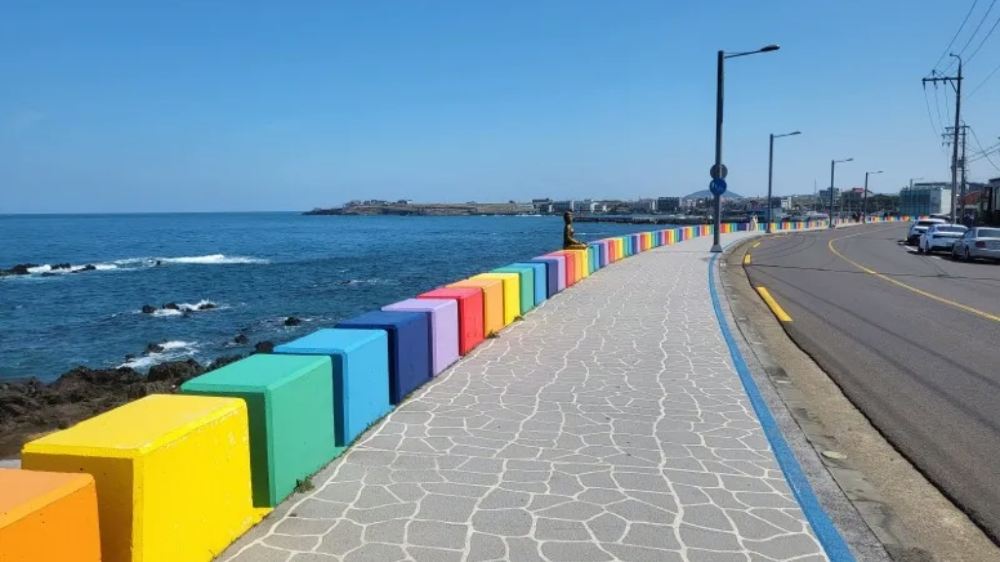 以彩虹色護牆與彩色石墩為標誌,搭配黑礁石碧海藍天,隨手拍都是大片。步行遊覽約15-20分鐘,沿途可見海女雕塑、海景咖啡廳與特色小店,適合旅行前後短途兜風或漫步。