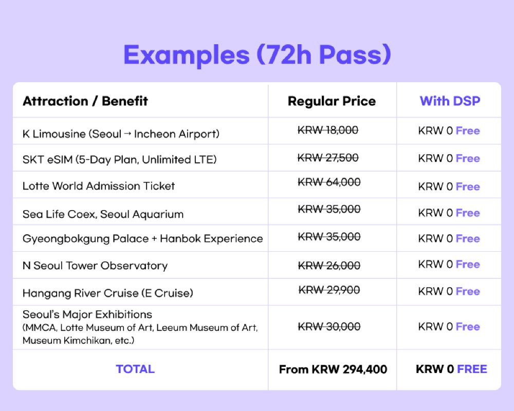 5. 根據文化日(每月最後一週星期三(2016年標準)等政府政策,故宮/美術館等免費入場,年齡(65歲以上等)免費入場優惠等,請有效利用通行證。