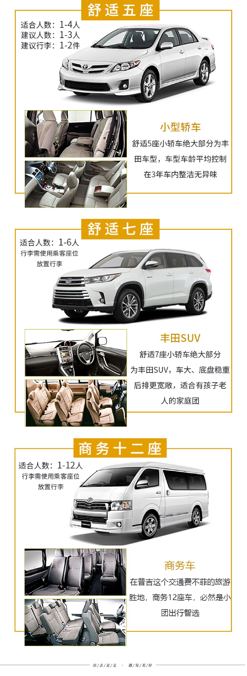 5 人座標準車型、7 人座舒適車型、12 人座中型巴士