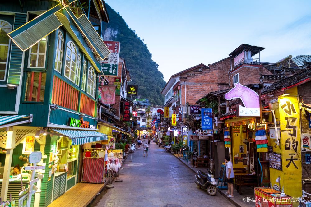 西街古鎮是陽朔最古老的街道,位於陽朔縣的中心地帶。西街全長517公尺(1,696英尺),寬8公尺(26英尺)。陽朔西街被譽為中國外國遊客造訪最頻繁的街道,因此也有「洋人街」之稱。若聽到當地年長婦女能說幾句英語,也無需驚訝,因為這條街素有「地球村」的美名。這裡有許多餐廳,最著名的菜餚是當地特色魚料理,您也可以在街上的特色咖啡館享用一杯咖啡。此外,許多商店提供摩托車或自行車租賃服務,讓喜愛自由探索陽朔的遊客能盡情騎行。