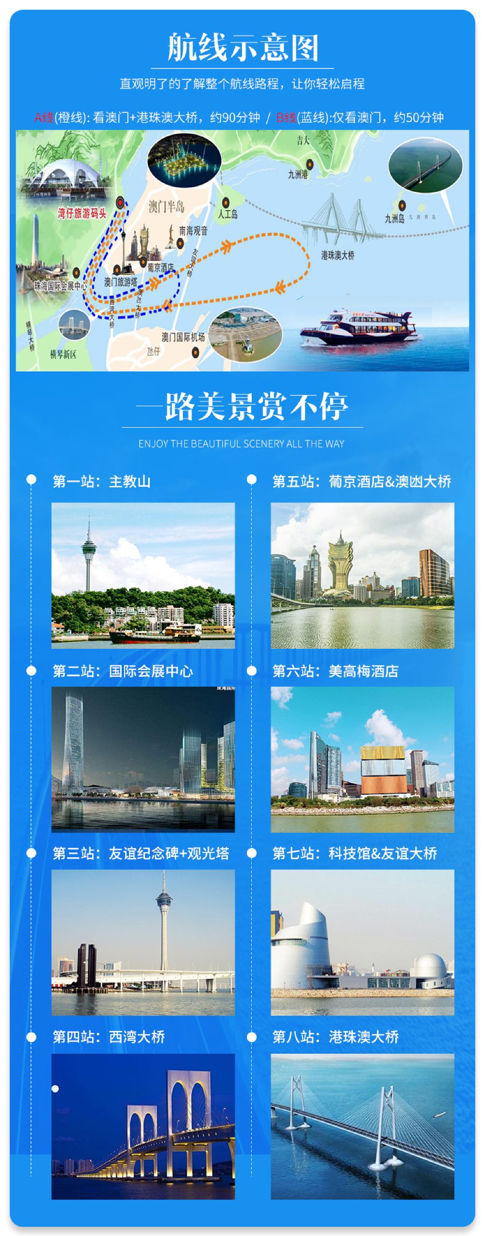 【聽】全程廣播介紹,感受一國兩制浪漫之都的獨特魅力。【遊】乘船出海,體驗浪漫海上之旅。【景】乘船欣賞澳門外景+港珠澳大橋,感受不一樣的視覺饗宴。