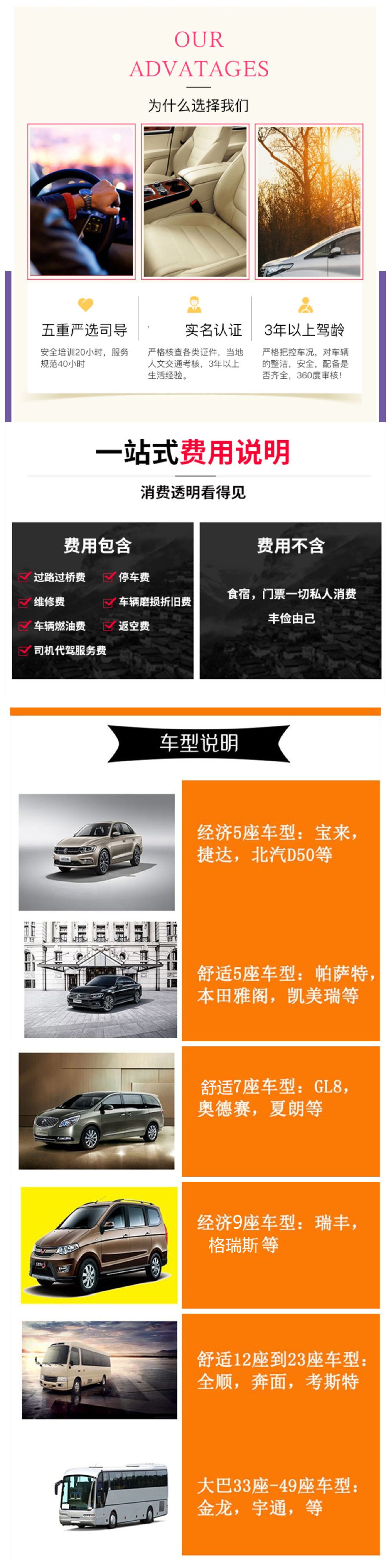 3.包車一份是一輛車的價格不含門票,沒有導遊,五環內任一個地點免費上門接送,出發時間自由,從接到到送回一共10小時。