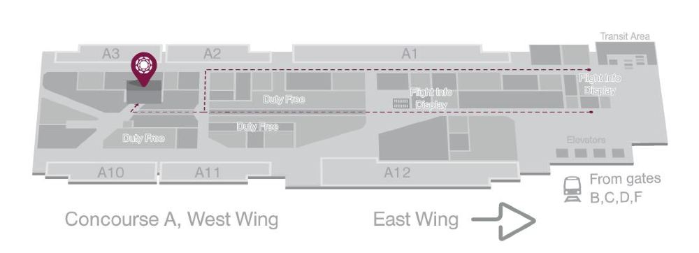位置:貴賓室位於A2及A3登機閘口之間。前往貴賓室的旅客,可於免稅店區搭乘電梯直達4樓。