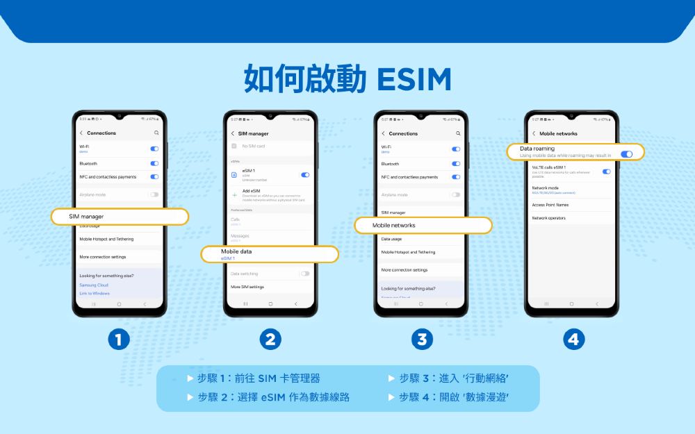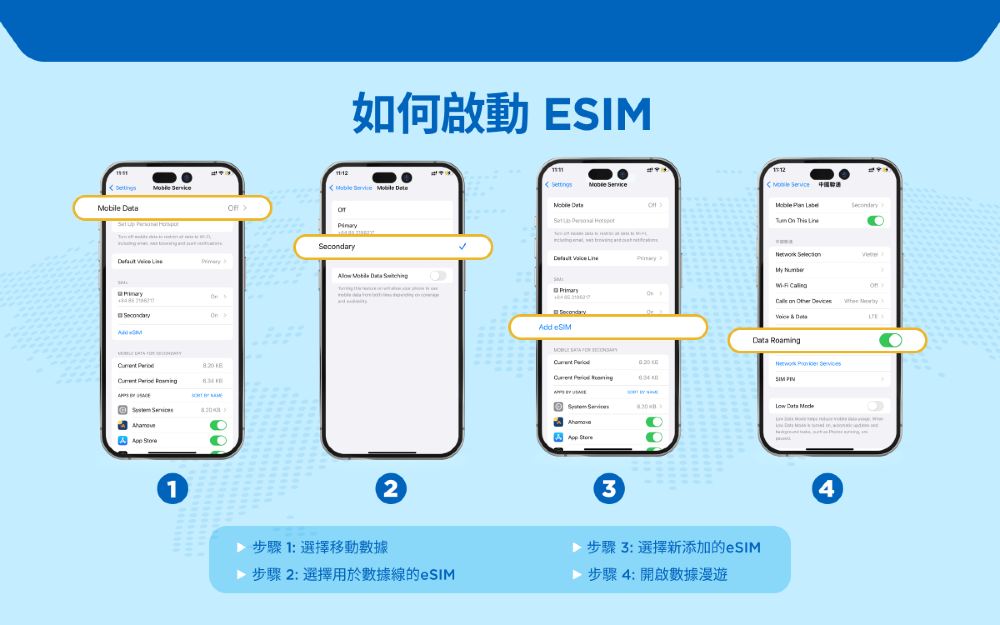 - 請確保 eSIM 的「數據漫遊」選項已啟用