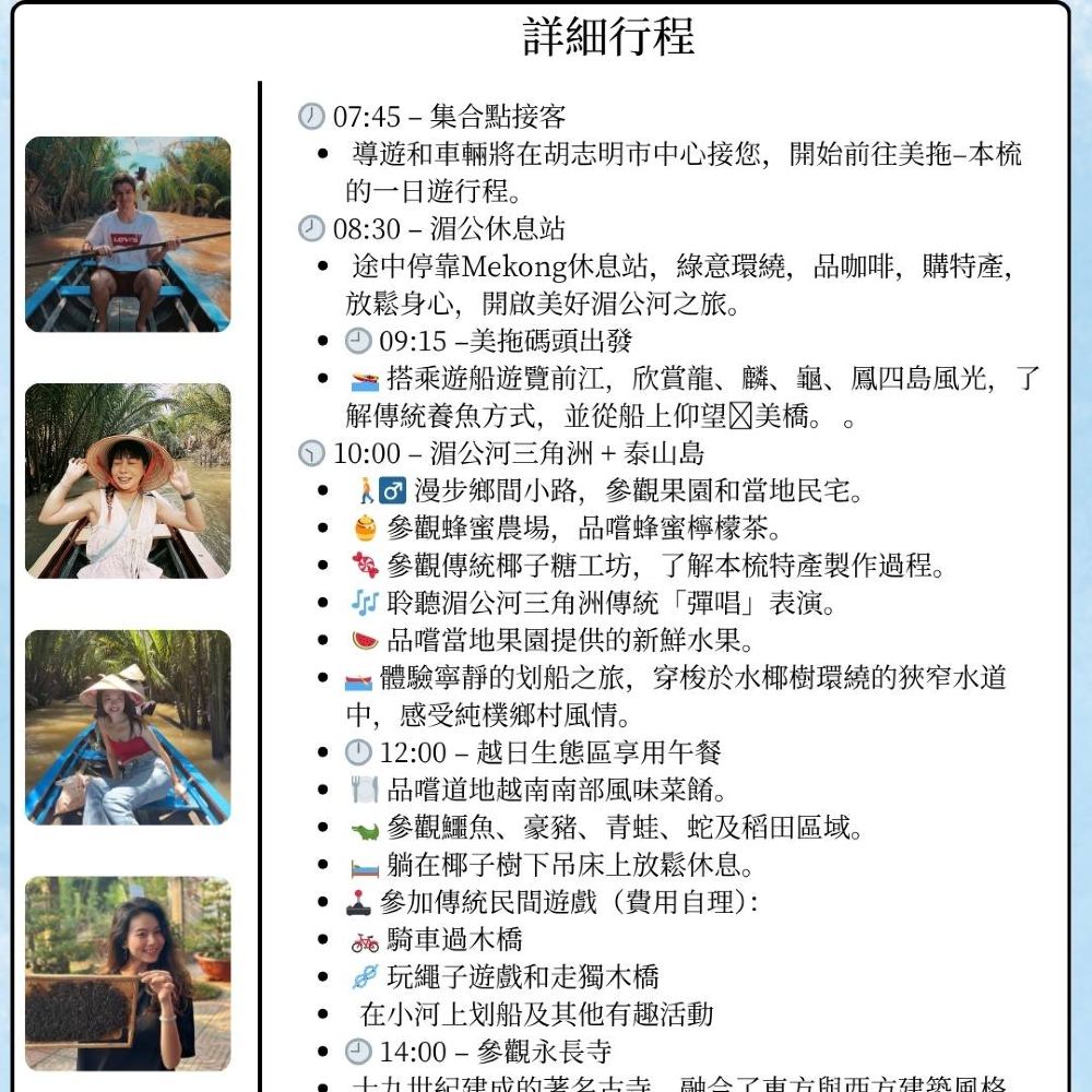 這條線路專為希望體驗越南南部自然風光與鄉村生活的遊客設計,行程安排合理,時間適中,適合家庭、朋友或個人出行。