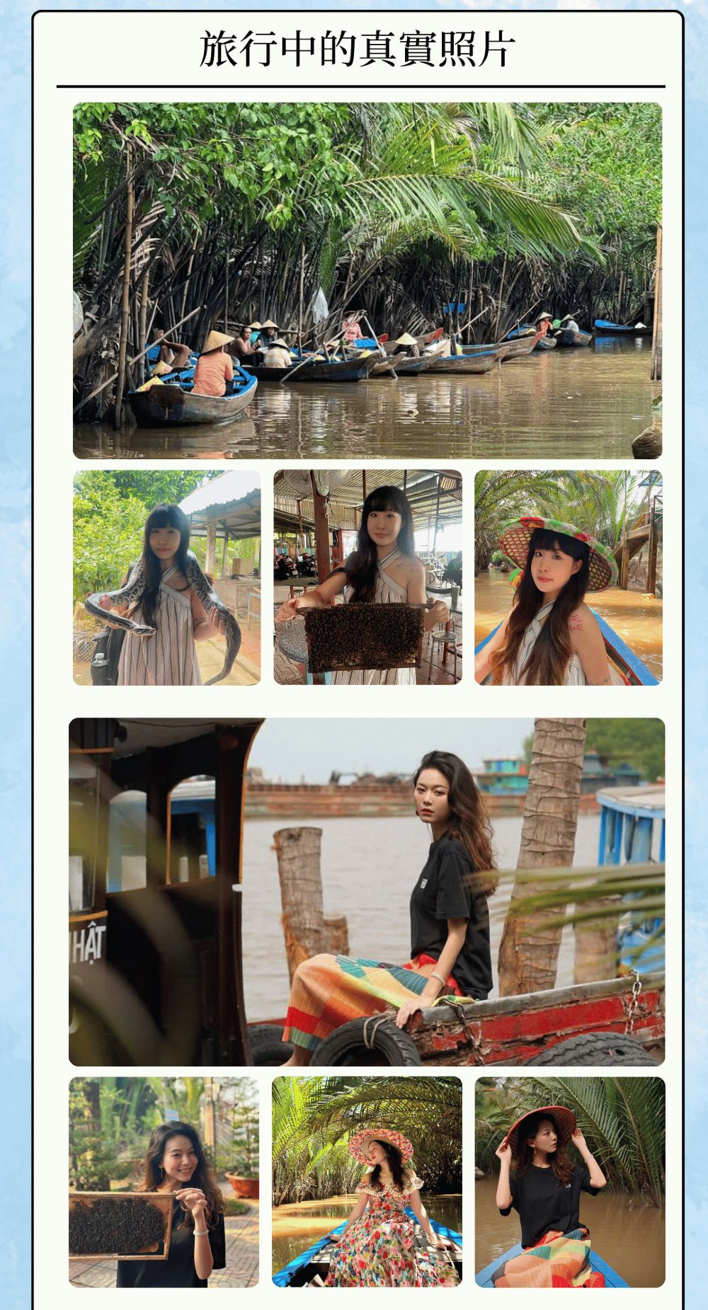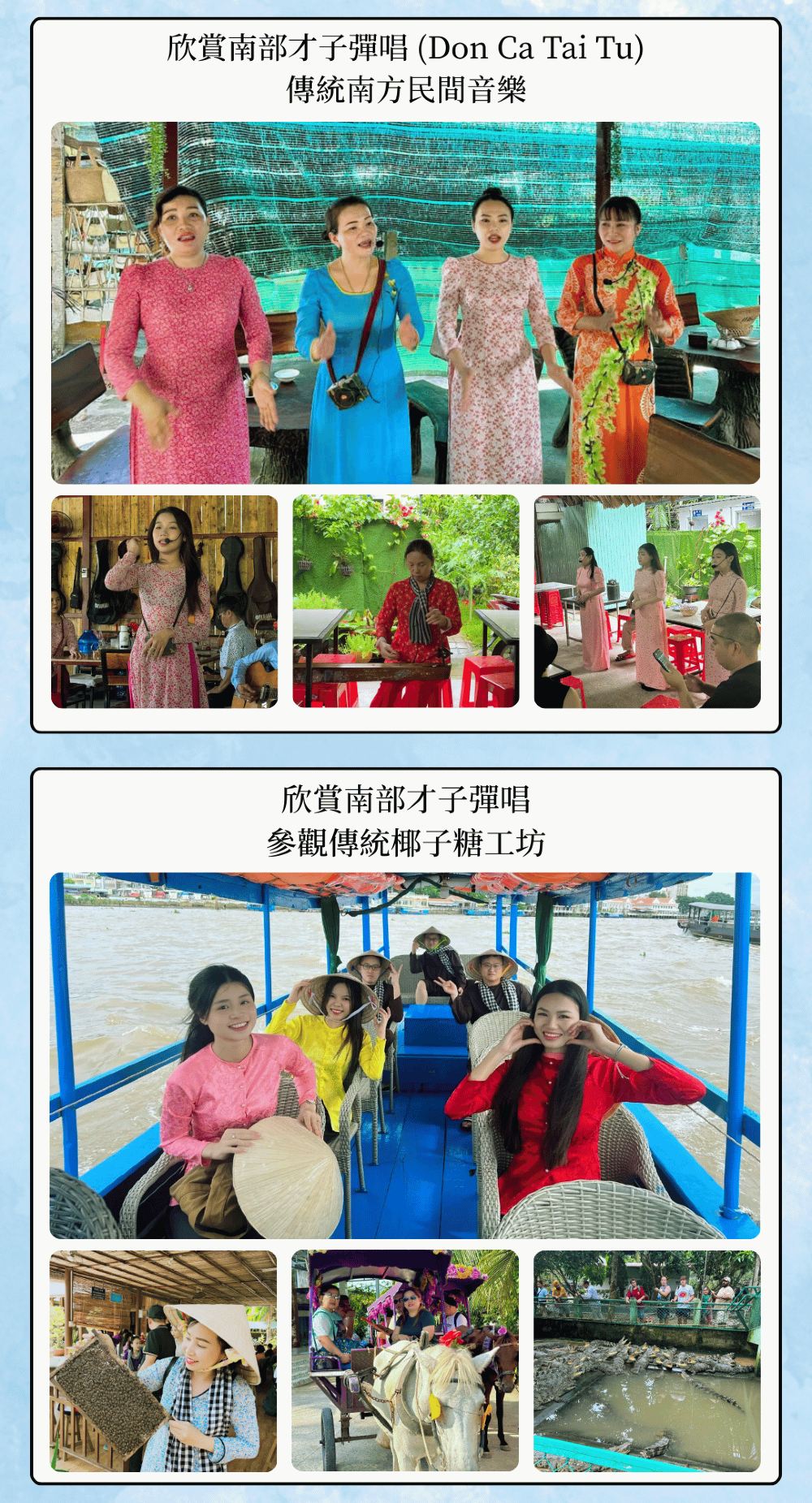 旅程中,您將乘坐傳統木船穿行在椰林水道之間,參觀當地家庭作坊,了解椰糖製作過程、欣賞越南傳統音樂表演,並可品嚐當地特色水果和茶點。