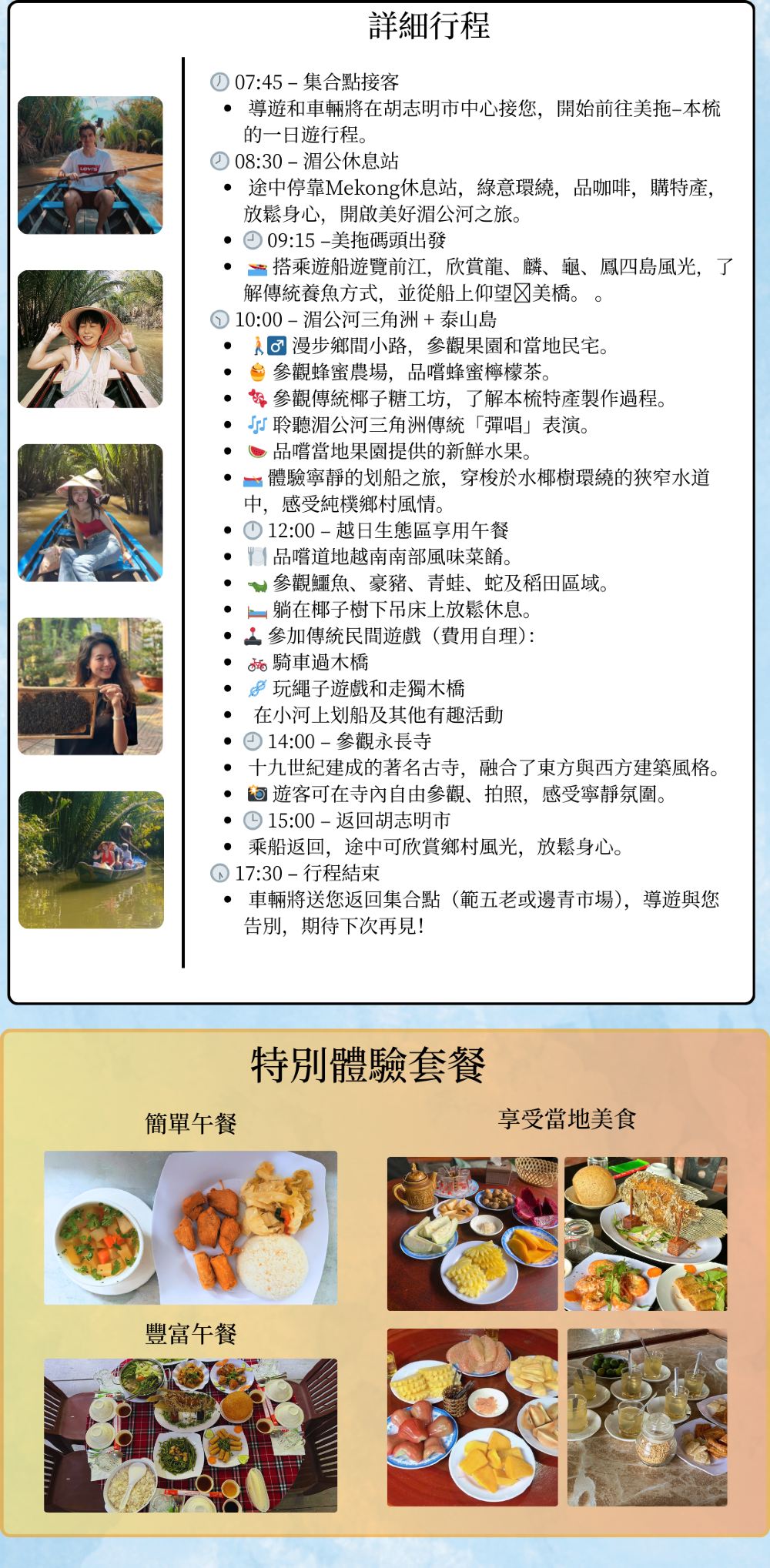 這條路線專為希望體驗越南南部自然風光與鄉村生活的遊客設計,行程安排合理,時間適中,適合家庭、朋友或個人旅行。