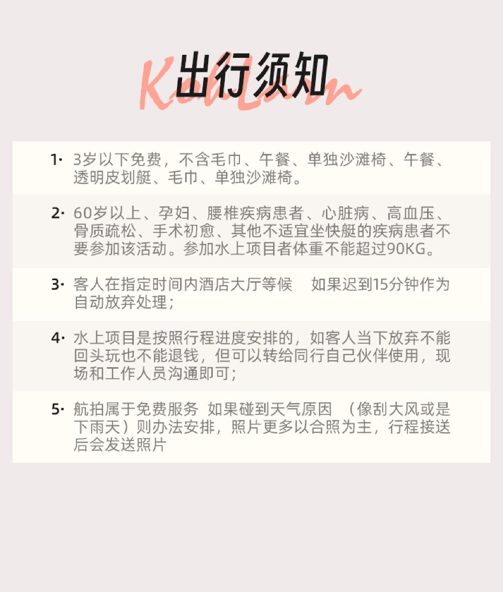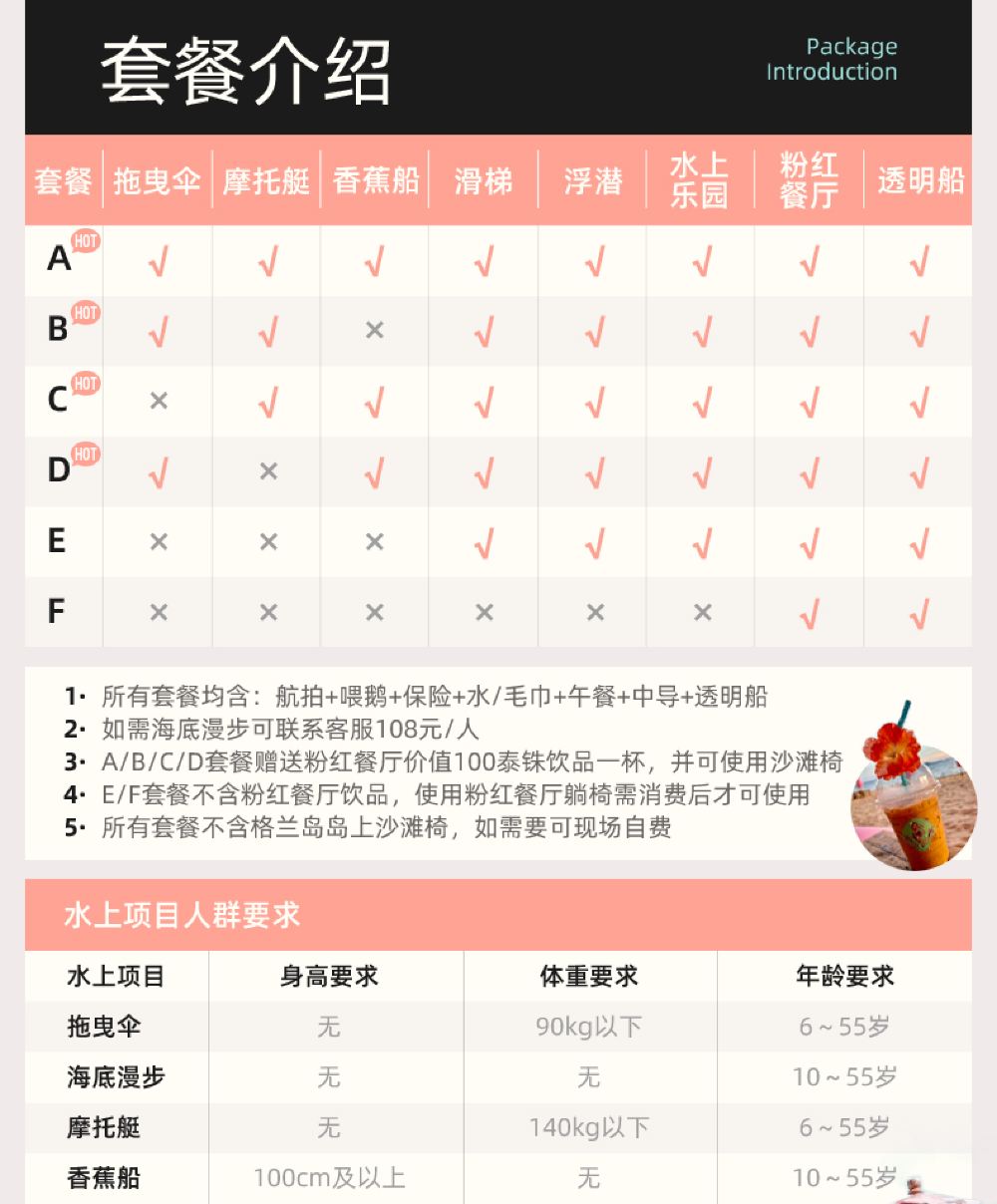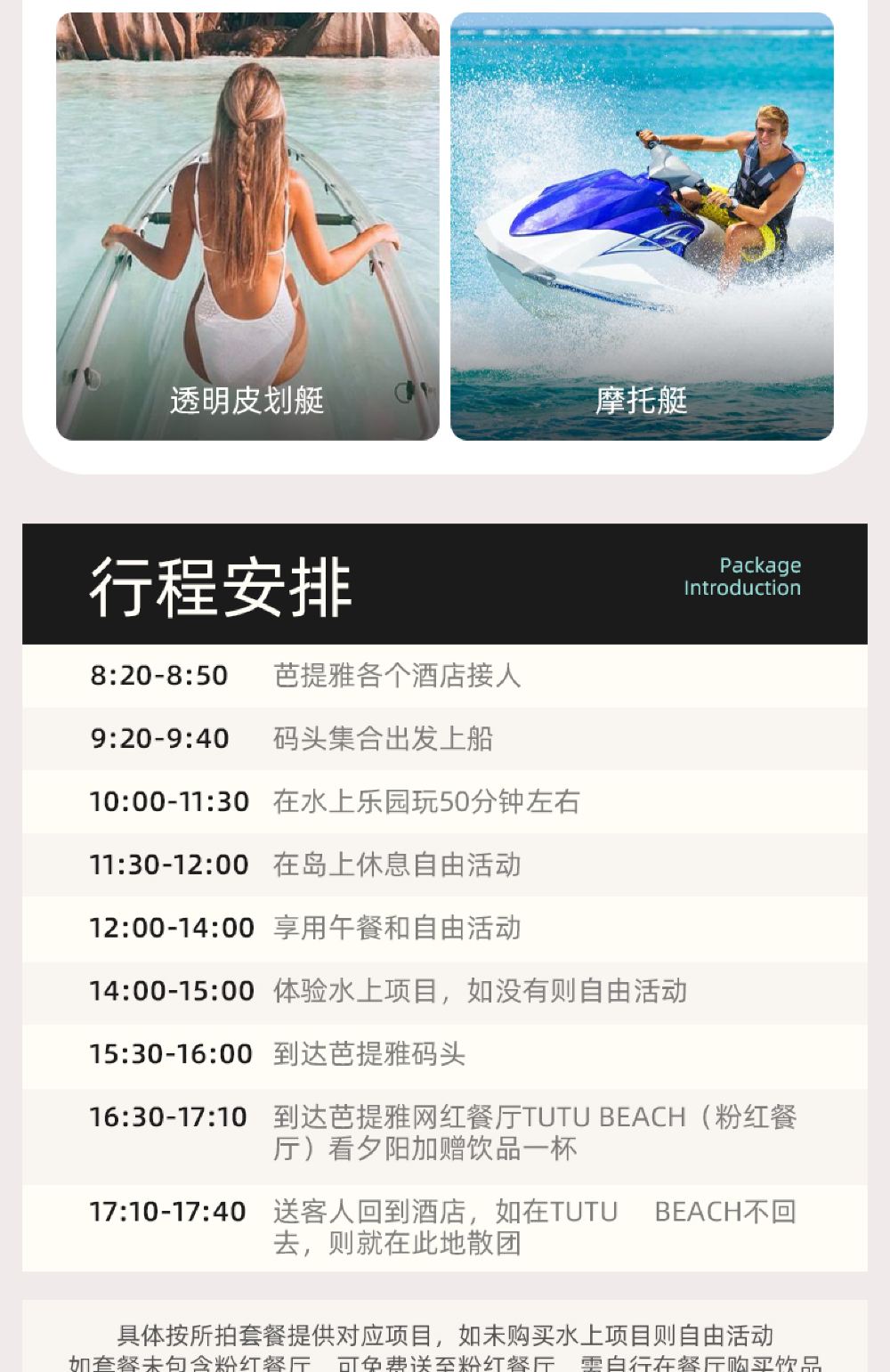 選擇了A餐,各類項目都很不錯,就是時間短了點,要想早點上沙灘躺平的,一定建議把準備溼身的衣服直接穿在身上出發,節約時間。躺椅100🐷,和租櫃子一個價,去玩🛥️和🍌船時候,東西放在躺椅上也沒有人拿。午餐是大雞腿配🍟礦泉水,出發時也會一人一瓶水,再給跟毛巾。下午返程後,去tutu beach 看了看,太遠了,其實意義不大,就去拍兩張照而已。