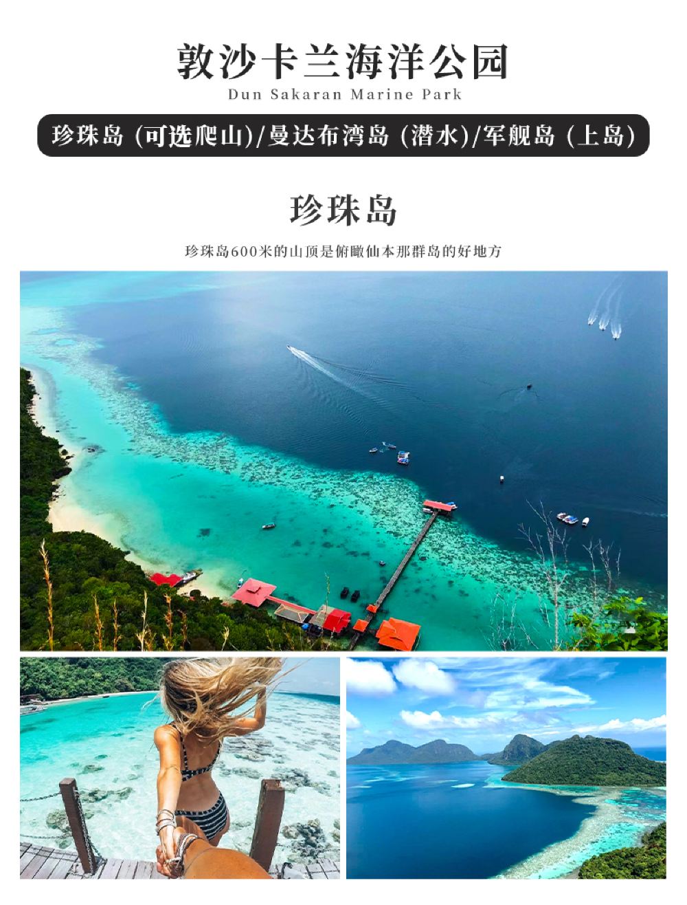仙本那敦沙卡蘭海洋公園+軍艦島+珍珠島+曼達布安島一日遊