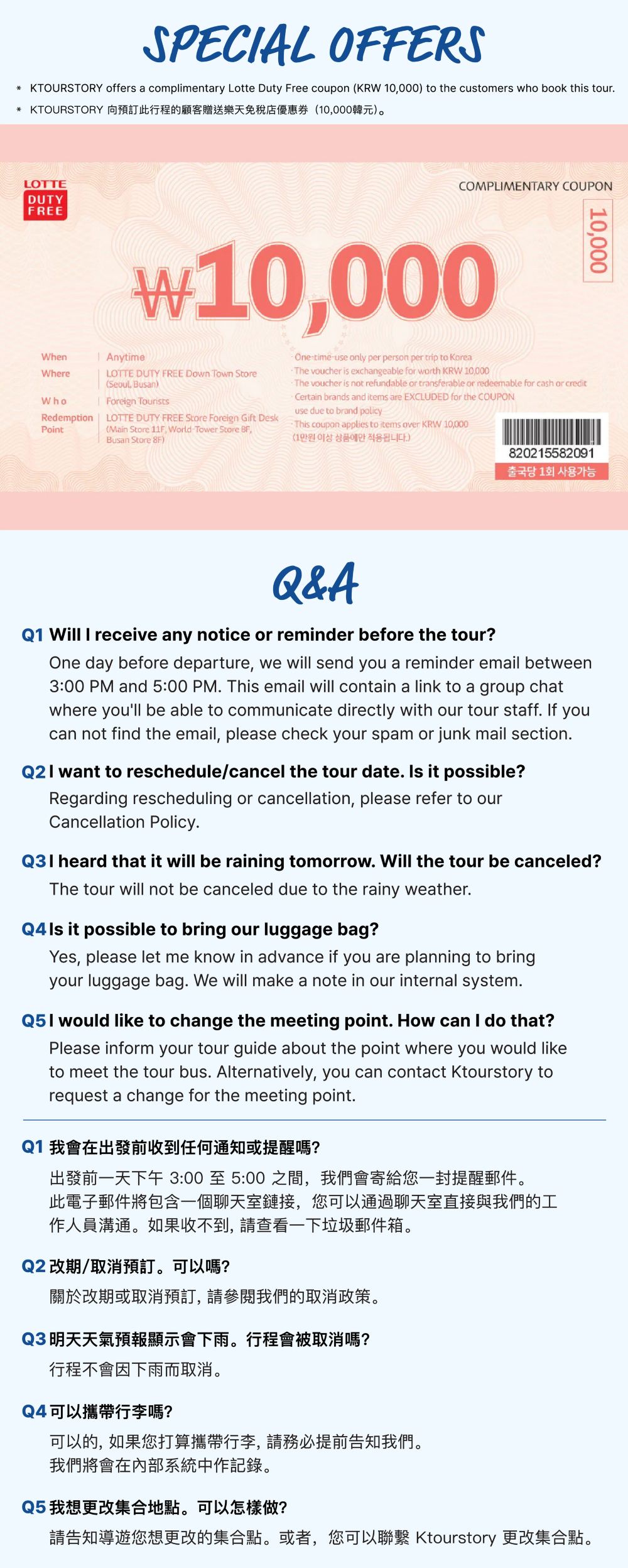 英文導遊Cindy和中文導遊홍하的服務很好,全程為我們耐心講解景點,雖然是大團,人多,但大家都很有素質,都很守時,沒有人影響其他人的行程。本次上午去了海東龍宮寺,體驗了膠囊小火車(需跟團四人一組噢),中午在導遊的帶領下去了一家本地餐廳,吃了美味的韓餐,參雞湯很正宗,魚的味道很新鮮,兩個人一共吃了170人民幣(大家可以參考下價格),下午去了甘川文化村以及白淺川文化村,獲得了完美的體驗。