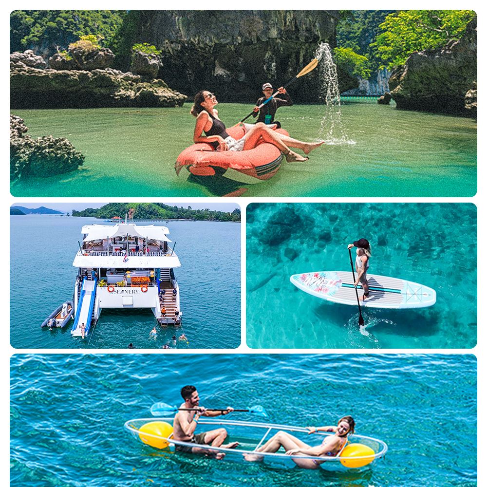 水上玩樂:️水上滑梯️+助推器️+劃槳板+玻璃船️+漂浮泳池️+皮划艇探洞1-2個