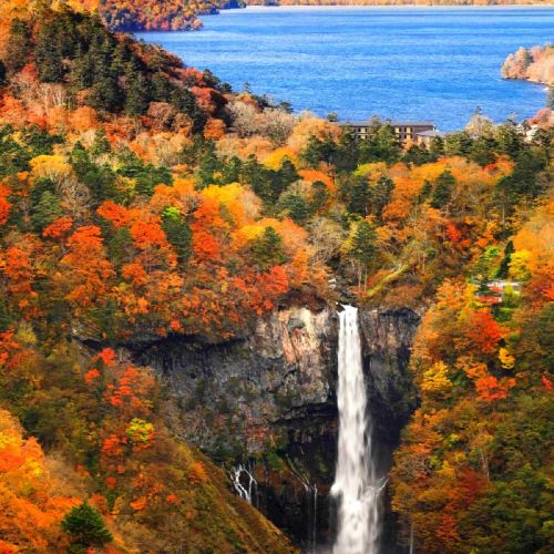 日本三大名瀑之一。中禪寺湖水從700公尺高處流下形成瀑布主要部分,高99公尺。上部岩石向前突出,岩隙中流出12個小瀑布。秋季四周紅葉漫布,景色幽美,為日光國立公園的遊覽中心,這裡有高山流水的意境。