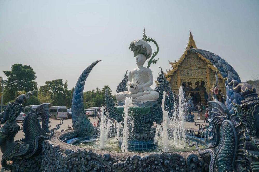 清萊藍廟 此屬性已經過翻新。 來自的創意作品 Ajarn Nok (Mr. Phutta Kapkaew) 或 Sala Nok,清萊本地藝術家和 Rong Suea Ten 村民的團聚。 通過建造一個寺廟大廳來擁有隱藏著佛陀教義的當代佛教藝術。 寺廟的牆壁採用深藍色和藍色的色調,給人一種沉穩清冷的感覺,與白色和金色調的精緻牆壁圖案相映成趣。 似乎像河流一樣流動 使其以其不尋常的顏色從其他寺廟中脫穎而出 這是一個勸說佛教徒回到寺廟學習佛陀的佛法以便在日常生活中應用的概念。
