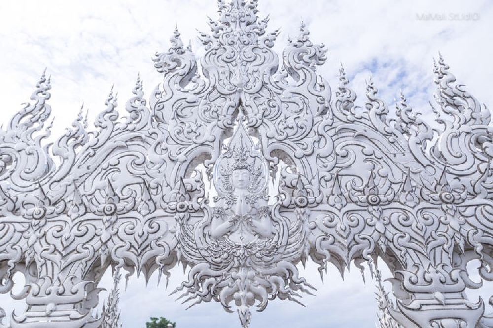 清萊白廟 的亮點是佛堂以白色為地板裝飾。 用迷人的玻璃裝飾,美麗而不同尋常。 灰泥上是泰式圖案。 特別是大本尊背後的佛像和北面的佛像,上面裝飾著半象半鳥的神話生物。 看起來異常美麗 和佛堂裡麵的壁畫 這是 Ajarn Chalermchai Kositpipat 本人的畫作。